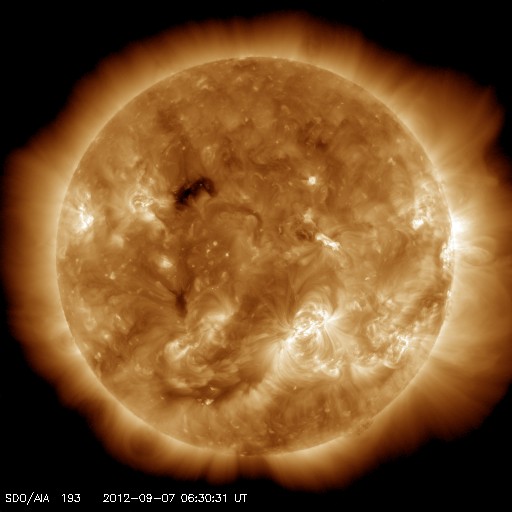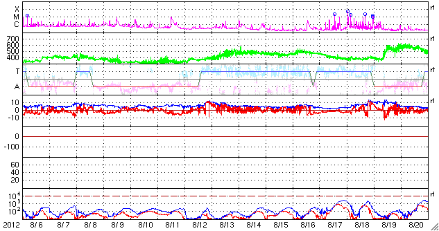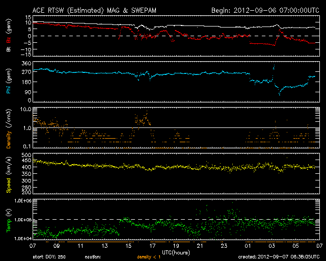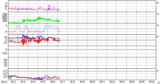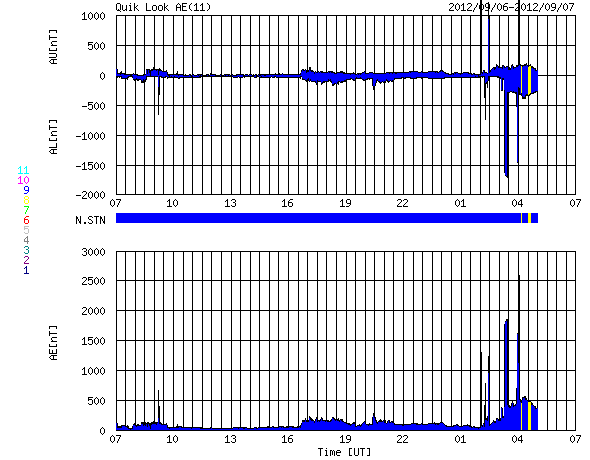 2012/ 9/ 7 15:39 更新 太陽風の磁場の強まりは終わり、平均的な風に戻っています。ペルーの写真をどうぞ。 担当 篠原 太陽風の磁場強度は、10nTから5nTに下がり、 強まりの状態は終わりました。 速度は、400km/秒と平均的な速さで安定しています。 強まっていた間、磁場の南北成分は北寄りの傾向が続き、 磁気圏は穏やかな状態が続きました。 しかし、磁場強度が下がりきったあたりから、 南向きに振れるようになり、 AE指数にも変化が現れ始めています(大きな振れはデータエラーです)。 この後も太陽風磁場が南寄りに推移すると、 中小規模のオーロラ活動が続きそうです。 昨日、M1.6の中規模フレアを起こした1560群は、 その後も、C8.0、C4.7と大きめの小規模フレアを起こしています。 しかし、もうほぼ西の端に達していて、 今後は、中央部の1564群の活動が強まるかどうかでしょう。 今日は、ペルーの写真を掲載します。 こちらへは、九州大学との共同研究として、 九大がペルーに設置している磁力計のメンテナンスと、 今後の新しい観測の打ち合わせのために来ています。 1枚目は、首都のリマに近いアンコンという観測所にある、 磁力計を設置している小屋です。 草木も生えていない荒涼とした大地にぽつんと建っています。 もちろん、写真の後ろには観測所の施設がありますし、 周囲に少し行くと住宅地も広がっているのですが、 それらの影響を受けない様、磁力計は何もない一番端に設置するので、 こんな写真になりました。 2枚目は、電離圏を観測するためにヒカマルカに設置されている、 巨大なレーダーのアンテナ群です。 左右いっぱい(もっと広がっています)、 地平線のあたりまでごちゃごちゃとしていて、 この写真だけでは何が写っているのか分かりませんが、 300m四方にわたって縦横に整然と並べられたアンテナたちです。 ここは50年前に建設されたとても有名なレーダーで、 初めて見に来たのですが、その巨大さに感動しました。 3枚目はペルーに初めて来たときにびっくりして飲んだインカ・コーラです。 こちらではみなさん普通に飲んでいます。 名前の強烈さに最初は驚きますが、特に違和感なく飲めるので、 こちらにいる間しか飲めないと思って愛飲しています(笑)。 明日は、リマから300km離れた別の観測所に行きます。 明日と明後日の更新は、現地のホテルのネット環境次第です。