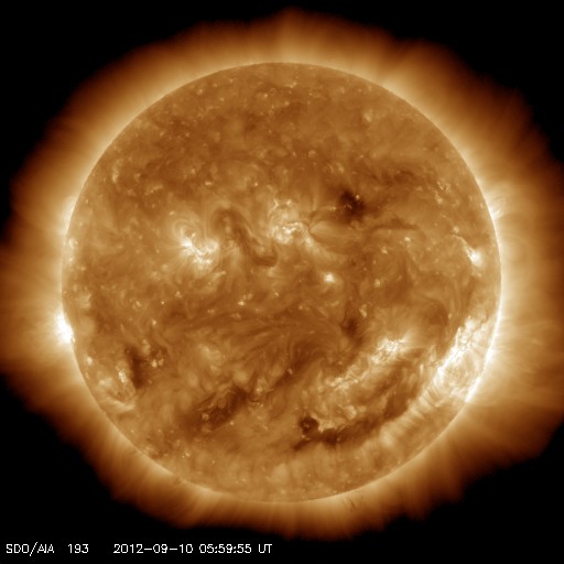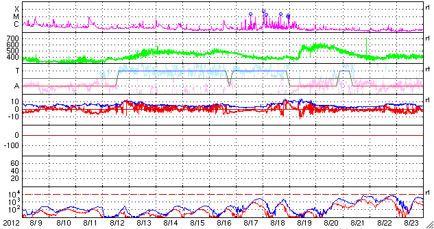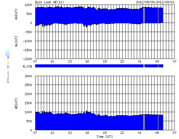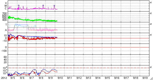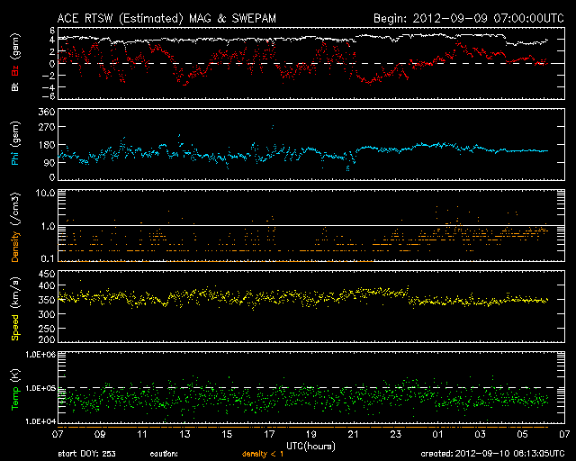 2012/ 9/10 15:14 更新 太陽風は低速です。昭和基地からのオーロラ写真をご覧下さい。 担当 篠原 一昨日(9月8日)の記事で、昭和基地の全天カメラのオーロラを紹介したところ、 第53次日本南極地域観測隊として昭和基地で越冬中の竹之下聖一さんより、 南極で撮影されたばかりの素晴らしい写真が届きましたので、ご紹介します。 1枚目は、一昨日の記事の写真と同じ時間帯に撮影されたオーロラです。 オーロラが空を覆い尽くすように輝き、迫力いっぱいです。 全天カメラでは得られない臨場感です。 2枚目は、9月4日の記事で紹介した、現地の9月3日のオーロラです。 この時は、記事でも赤みがかったオーロラを紹介していましたが、 現地では基地の背後にこのように赤いオーロラが輝いていたのです。 この時、雪面まで赤く染まっています。 緑と赤のコントラストが印象的な2枚です。 本当にありがとうございました。 現在の太陽風は、速度は350km/秒と低速の風になり安定しています。 磁場強度も、4nTとやや弱めの値です。 磁気圏は静穏だと思われますが、 AE指数はデータエラーが含まれている様で、 幅の広い不正確なグラフになっています。 太陽風は、この後も穏やかな風が続きそうです。 ただし、SDO衛星AIA193に見えている小さなコロナホールの影響が、 明日以降に多少やって来るかもしれません。 太陽は、西にだいぶ傾いた1564黒点群で、 今朝、10日7時(世界時9日22時)に、M1.2の中規模フレアが発生しています。 昨日も同じ様な時間帯にM1.4のフレアが起きていて、 GOES衛星のX線グラフには、似た様な山が8日、9日と続いています。 フレアの発生は、全体としては落ち着いて来ている印象です。 今日はリマに戻ってきました。 300kmほどですが南に下ると(高緯度側なのですが)、 昼は晴天で日差しが強いため、暑いくらいだったのですが、 夜のリマに戻ると、室内でも厚着をしないと寒く感じるほどに冷えています。 いよいよ、明日の夜に日本へ発ちます。 天気予報を見ると、鹿児島はまだまだ30度ですね・・・ ![]() 南極の昭和基地で、9月7〜8日に撮影されたオーロラ。 (c) 竹之下聖一氏 ![]() 南極の昭和基地で、9月3日に撮影された赤いオーロラ。 (c) 竹之下聖一氏 ![]() SDO衛星のAIA193カメラによる太陽コロナの様子 (c) SDO (NASA) ![]() SDO衛星による太陽の可視光写真。マウスの矢印を写真に重ねると、黒点番号付きの写真に切り替わります。 (c) SDO (NASA) ![]() ACEが観測した太陽風の磁場(1番上の枠、白線は全体の強度、赤線は南北成分) および、太陽風の密度(3番目の橙線)、速度(4番目の黄線) (c) NOAA/SWPC ![]() リアルタイムAE指数 下段のAEグラフの値が高くなると、オーロラ活動が活発化しています。 (c) 京都大学, NICT ![]() 27日の太陽周期に合わせたデータプロット 太陽が同じ面を地球に向けていた27日前の変化から、今後を予想することができます。 (c) 作図:宇宙天気ニュース