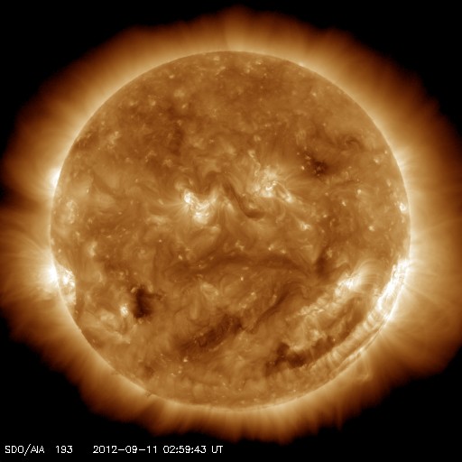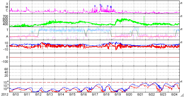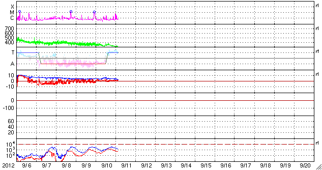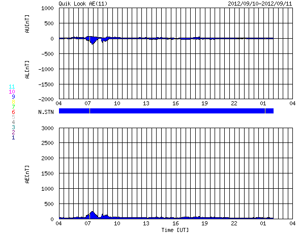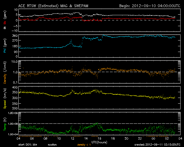 2012/ 9/11 12:16 更新 太陽風は低速で、磁気圏も穏やかです。Cクラスのフレアが発生しています。 担当 篠原 これから帰国便に乗るため、リマ空港にいます。 少し時間が取れたので、簡単に現況を報告します。 ただし、昨日のニュースでは、南極からお送り頂いた、 とてもきれいなオーロラの写真を紹介しました。 今日の更新時刻が早まったので、 ご覧になっていない方は、昨日のニュースをぜひどうぞ。 太陽風は、低速の風が続いています。 昨日の350km/秒から、現在は300km/秒まで下がっています。 磁場強度は、5nT前後と平均的な強さですが、 ACEの図の途中で、 太陽風磁場のセクター境界がやって来た様です。 詳しくは、27日周期の図をご覧ください。 今回は、太陽風の状態は特に変化していません。 太陽風磁場の南北成分は、ほとんど北向きです。 このため、磁気圏はとても穏やかです。 AE指数はほとんど変化していません。 太陽風は、小さなコロナホールの影響がなければ、 このまま穏やかに推移しそうです。 太陽では、今朝、西の端の1564黒点群で、 C6.0の小規模フレアが、 続いて、東の端から現れた1569黒点群で、 C3.5の小規模フレアが発生しています。 1569黒点群は、これから太陽の中心に向かいます。 今後、どの様な活動を起こすでしょうか。 今日は、13時から17時まで、 高専内のネットワークが停止するため、 このニュースはアクセスできなくなります。 それでは、次回は日本からの更新です。 ![]() SDO衛星のAIA193カメラによる太陽コロナの様子 (c) SDO (NASA) ![]() SDO衛星による太陽の可視光写真。マウスの矢印を写真に重ねると、黒点番号付きの写真に切り替わります。 (c) SDO (NASA) ![]() ACEが観測した太陽風の磁場(1番上の枠、白線は全体の強度、赤線は南北成分) および、太陽風の密度(3番目の橙線)、速度(4番目の黄線) (c) NOAA/SWPC ![]() リアルタイムAE指数 下段のAEグラフの値が高くなると、オーロラ活動が活発化しています。 (c) 京都大学, NICT ![]() 27日の太陽周期に合わせたデータプロット 太陽が同じ面を地球に向けていた27日前の変化から、今後を予想することができます。 (c) 作図:宇宙天気ニュース