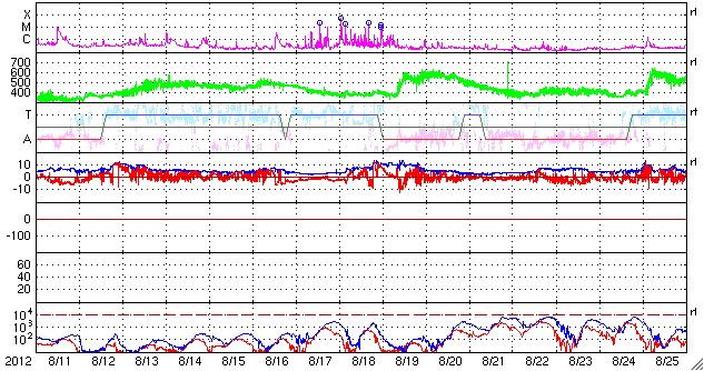 (c) SDO (NASA) ![]() SDO衛星による太陽の可視光写真。マウスの矢印を写真に重ねると、黒点番号付きの写真に切り替わります。 (c) SDO (NASA) ![]() GOES衛星の太陽X線データ (c) NOAA/SWPC ![]() ACEが観測した太陽風の磁場(1番上の枠、白線は全体の強度、赤線は南北成分) および、太陽風の密度(3番目の橙線)、速度(4番目の黄線) (c) NOAA/SWPC ![]() リアルタイムAE指数 下段のAEグラフの値が高くなると、オーロラ活動が活発化しています。 (c) 京都大学, NICT ![]() 27日の太陽周期に合わせたデータプロット 太陽が同じ面を地球に向けていた27日前の変化から、今後を予想することができます。 (c) 作図:宇宙天気ニュース
