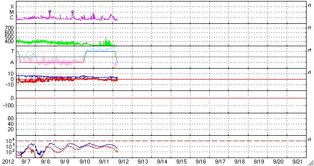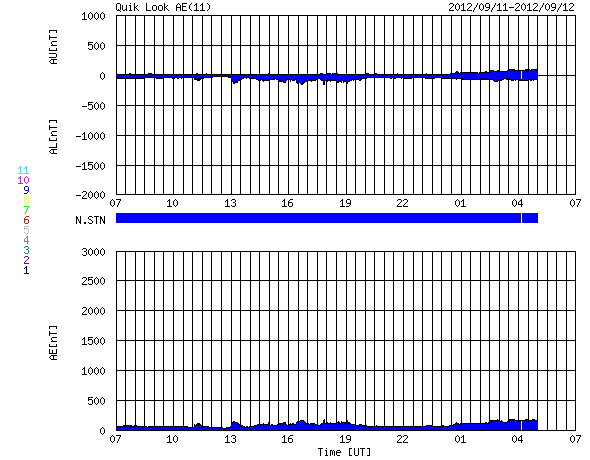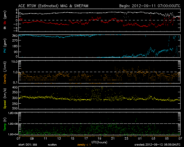 2012/ 9/12 15:57 更新 1564黒点群は西に沈みました。太陽風はかなり低速です。 2012/ 9/12 16:06 追加 SDO AIA193の太陽コロナ写真 担当 篠原 太陽では、1564黒点群が西の端に沈んでいきました。 その直前、昨夜、11日20時(世界時11日11時)にC2.1、 そして、今朝、12日7時(世界時11日22時)にC4.1と、 Cクラスのフレアを起こしています。 C4のフレアでは、 CMEも噴き出しているかもしれません。 地球からは横向きなので、影響はありません。 一方、南東の端には、 1569群とその次の黒点群が見えていますが、 今のところ特に活動的ではないようです。 太陽風は、速度が300km/秒から280km/秒に下がり、 かなり低速の風になっています。 磁場強度は、3〜4nTと弱めです。 磁気圏も静穏で、 AE指数はほとんど変化していません。 ただ、磁場の南北成分は弱い南寄りになっているので、 ある程度のオーロラ活動は起きていて、 昭和基地の全天カメラでは、淡いオーロラが写っています。 太陽風は、今後も穏やかな風が続きそうです。 先ほど、ヒューストン経由で、 無事に成田に着きました。 リマを出てから26時間かかりました。 日本は蒸し暑いです! 暑さの違いに、体が驚いています。 今夜の便で鹿児島へ帰るので、 旅行としてはまだ6時間残っています。 2012/ 9/12 16:06 追加 (篠原) 関連の図はページの最後にあります ちょうど真っ黒な写真が載ってしまったので、 追加します。