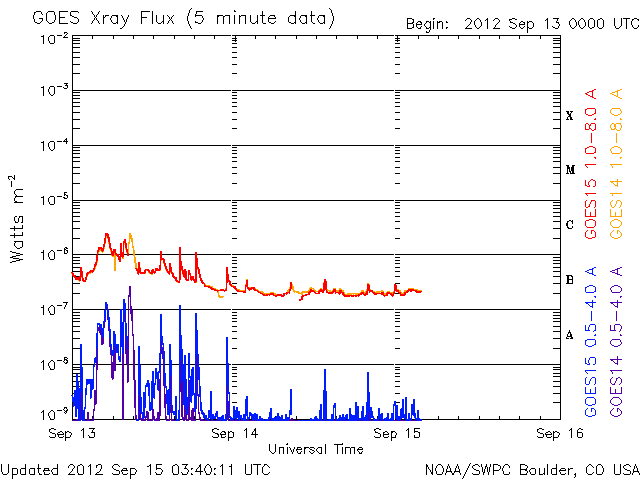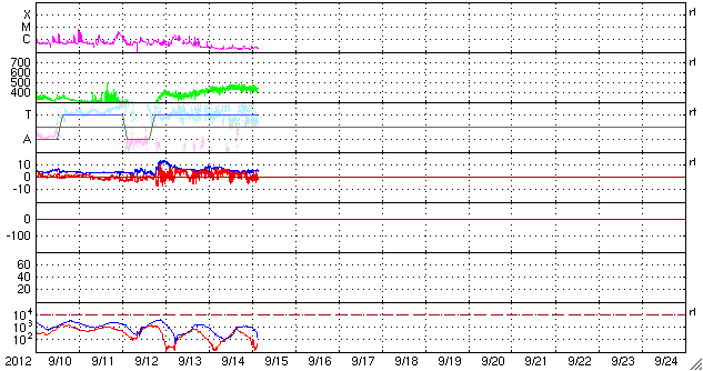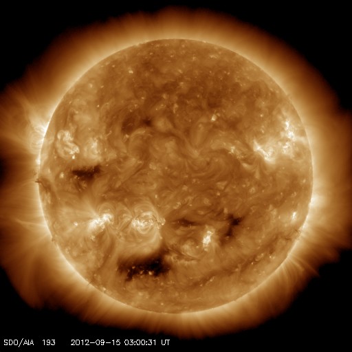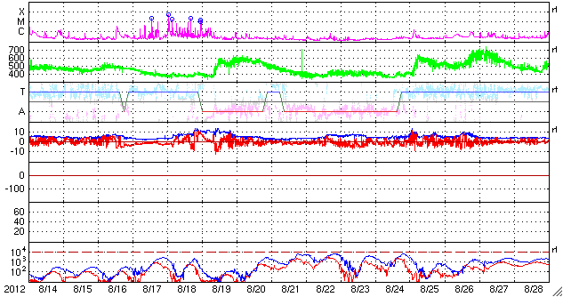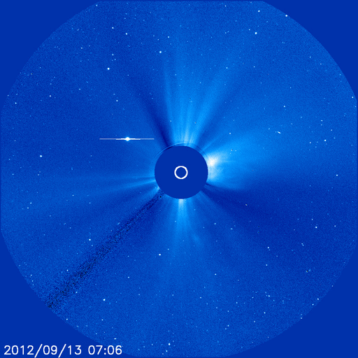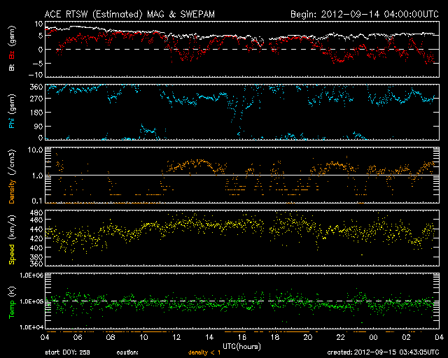 2012/ 9/15 12:44 更新 太陽風は平均的な速度で安定しています。今後、太陽風の速度が高まりそうです。 担当 篠原 昨日の記事のフィラメント噴出によるCME(太陽ガスの放出現象)を、 SOHO衛星のLASCO C3による動画で紹介します。 太陽の右上方向を中心に、ガスが大きく広がっています。 広がる速度はゆっくりの様で、地球への到来は17日になりそうです。 太陽のフレア活動は、静かになっています。 GOES衛星のX線グラフは西の端に見えていた活動領域が 向こう側に回ってしまった影響もあり、 全体のレベルが低下して、変化もほとんどなくなっています。 1569黒点群の活動は弱まっているようです。 太陽風は、420〜440km/秒と昨日より若干上がっていますが、 平均的な速さで安定しています。 磁場強度は5nTに下がっています。 磁場の南北成分は、ここまでは北寄りに推移していて、 磁気圏の活動も静穏です。 SDO衛星AIA193を見ると、 太陽の南半球側にはコロナホールがいくつかあり、 その先頭(右端)は太陽の西側に半分ほど進んでいます。 今後、この領域からの影響によって太陽風の速度が上昇しそうです。 また、太陽風磁場のセクターの切り替わりがやって来て、 磁場が南寄りに振れるようになって、磁気圏の活動度が上がる可能性があります。 CMEの到来もあり、来週前半はオーロラ活動が高まるかもしれません。 鹿児島は、台風16号の影響で風が強まり始めています。 明日から明後日にかけて、荒れそうな様子です。 ![]() SOHO衛星LASCO C3による、昨日のCMEの様子。 (c) SOHO (ESA & NASA)、 (動画加工 : 宇宙天気ニュース) ![]() SDO衛星のAIA193カメラによる太陽コロナの様子 (c) SDO (NASA) ![]() SDO衛星による太陽の可視光写真。マウスの矢印を写真に重ねると、黒点番号付きの写真に切り替わります。 (c) SDO (NASA) ![]() GOES衛星の太陽X線データ (c) NOAA/SWPC ![]() ACEが観測した太陽風の磁場(1番上の枠、白線は全体の強度、赤線は南北成分) および、太陽風の密度(3番目の橙線)、速度(4番目の黄線) (c) NOAA/SWPC ![]() リアルタイムAE指数 下段のAEグラフの値が高くなると、オーロラ活動が活発化しています。 (c) 京都大学, NICT ![]() 27日の太陽周期に合わせたデータプロット 太陽が同じ面を地球に向けていた27日前の変化から、今後を予想することができます。 (c) 作図:宇宙天気ニュース