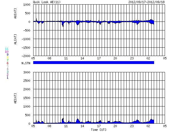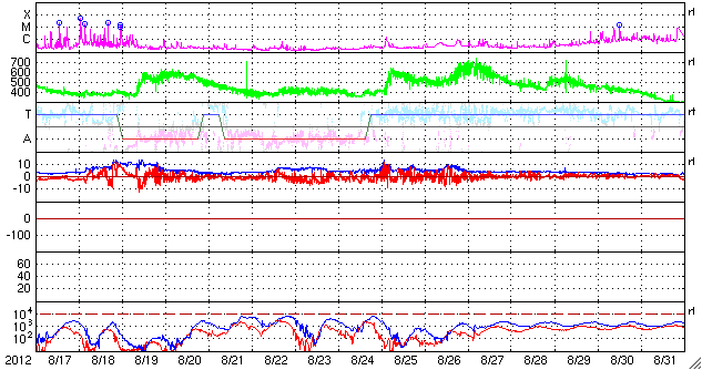 (c) NOAA/SWPC ![]() SDO衛星のAIA193カメラによる太陽コロナの様子 (c) SDO (NASA) ![]() SDO衛星による太陽の可視光写真。マウスの矢印を写真に重ねると、黒点番号付きの写真に切り替わります。 (c) SDO (NASA) ![]() GOES衛星の太陽X線データ (c) NOAA/SWPC ![]() ACEが観測した太陽風の磁場(1番上の枠、白線は全体の強度、赤線は南北成分) および、太陽風の密度(3番目の橙線)、速度(4番目の黄線) (c) NOAA/SWPC ![]() リアルタイムAE指数 下段のAEグラフの値が高くなると、オーロラ活動が活発化しています。 (c) 京都大学, NICT ![]() 27日の太陽周期に合わせたデータプロット 太陽が同じ面を地球に向けていた27日前の変化から、今後を予想することができます。 (c) 作図:宇宙天気ニュース
