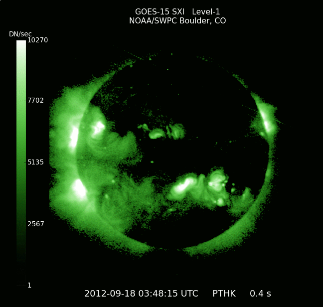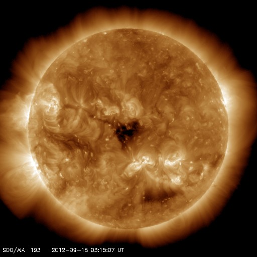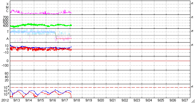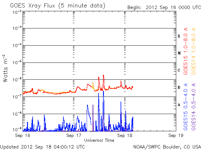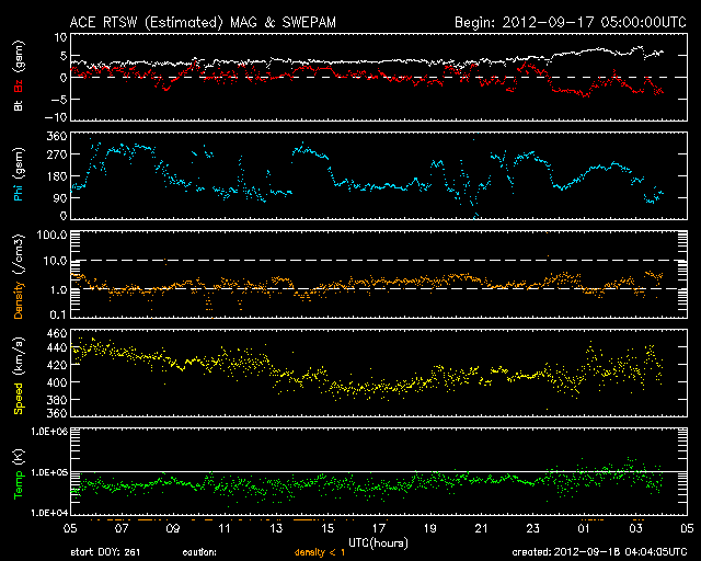 2012/ 9/18 13:04 更新 太陽の東端でフレアが起きています。太陽風は穏やかです。 担当 篠原 太陽は、西の端の1567黒点群でC1.1、 南東の端でC1.5、北東の端でC2.1と、 端の方ばかりで小さなフレアが発生しています。 太陽の東の端には、南北にそれぞれ活動的な領域がある様で、 GOES衛星X線カメラの写真を掲載しますが、 左側の端に、上下に明るい領域が並んでいます。 今後、こちら側にどんな領域がやって来るでしょうか。 太陽の南西にある3つの黒点群は、小さくなっている印象です。 太陽風は、穏やかな状態が続いています。 速度は、440km/秒から400km/秒へ下がり、現在は420km/秒付近です。 磁場強度が4nTから7nTへやや強まる変化が見られる程度です。 CMEの影響は特に見られないままになるのでしょうか。 磁気圏も概ね静穏でしたが、 現在の太陽風磁場の南北成分が、南寄りに-3nTほどで推移しているため、 現在、オーロラの活動がやや強まっているかもしれません。 SDO衛星AIA193を見ると、 小さなコロナホールがちょうど太陽の中心に来ています。 3日後の、21日頃の太陽風に影響が見られそうです。 その様子は、27日周期の図の前周期、 8月25日以降の変化で見ることができます。 この頃と比べると、コロナホールは少し小さくなっていて、 太陽風の影響も弱まるかもしれません。