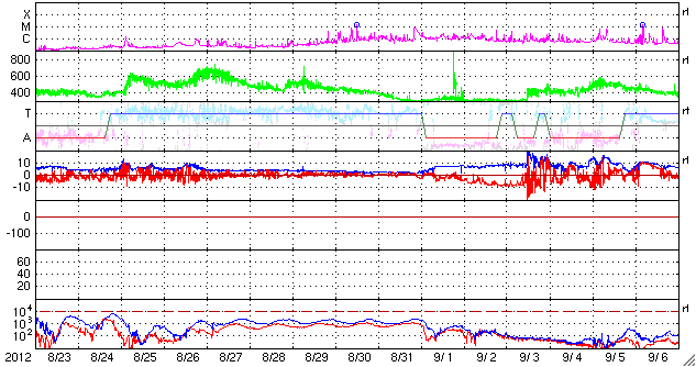 - 2012/ 9/20 13:32 太陽風の磁場が南向きに強まり、磁気圏活動が活発になりました。