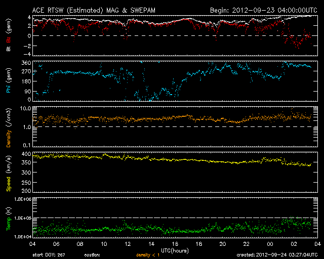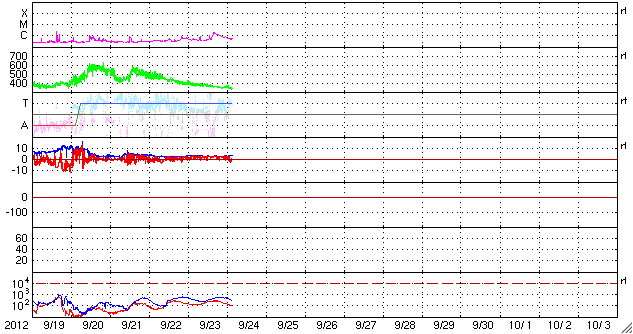 - 2012/ 9/23 14:30 太陽風はやや低速で、磁気圏も穏やかです。太陽も静かです。