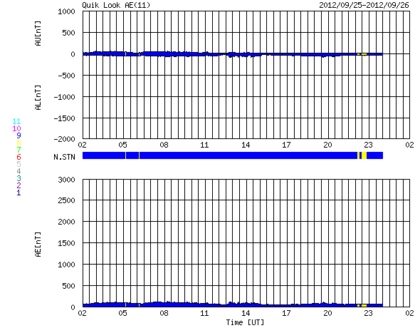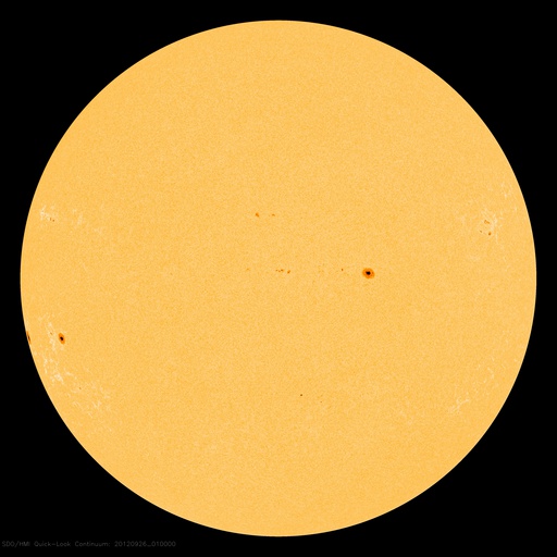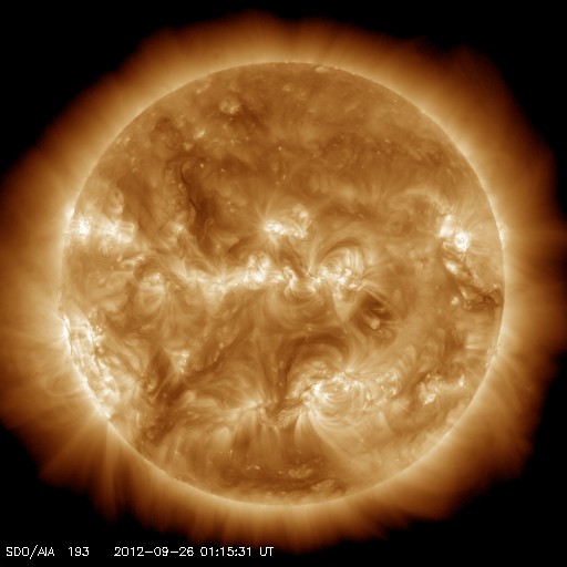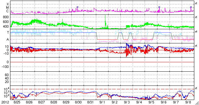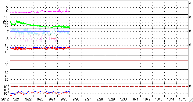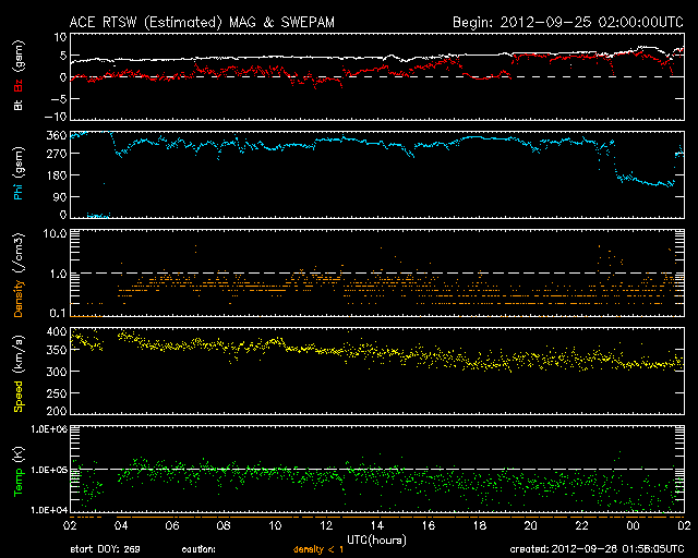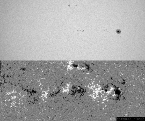 2012/ 9/26 10:59 更新 C3、C4のフレアが発生しました。太陽風はかなり低速になっています。 担当 篠原 太陽の黒点群が増えています。 北東から1580群が上がってきて、中央部には1581群が出現しました。 また、南東の端にももう一つ新しい黒点が見えています。 黒点群番号の表示をさせると、なかなかにぎやかです。 中央部北半球側の1575群、1577群のあたりは、 東西に一列に黒点が並んでいます。 この辺りの可視光写真と磁場写真を切り抜いて並べてみました(1枚目の写真)。 磁場の分布をみると、黒点の並びの更に左にも強まりが続いていて、 一直線に白黒白黒・・・と並んでいます。 これは磁石のN極S極N極S極・・・という並びです。 上の可視光の写真と見比べると、 どの黒点がNなのか、Sなのかを見つけることもできます。 気付いてみると、黒点の出現緯度もだいぶ低くなって、 赤道に近づいてきました。 活動周期の極大期の中盤を迎えていることを実感します。 黒点の出現緯度の長期変化は、 SIDCのこのページの下の図をご覧ください。 太陽は、昨日の昼に、1577群でC3.6、 昨夜、1580群でC4.5のフレアが発生しています。 この他にも、C1のフレアが4回ほど起きていて、 少しにぎやかになっています。 東から現れた新しい領域など、この後も活動に注目してください。 太陽風は、大きく速度が下がって、320km/秒とかなり遅い風になっています。 磁場強度は5nTと平均的な状態です。 磁気圏は静穏で、AE指数は全く変化していません。 穏やかな状態はこのまましばらく続きそうです。 ![]() SDO衛星の可視光と磁場写真による、北半球の黒点の並び。 (c) SDO (NASA)、 (写真加工 : 宇宙天気ニュース) ![]() SDO衛星のAIA193カメラによる太陽コロナの様子 (c) SDO (NASA) ![]() SDO衛星による太陽の可視光写真。マウスの矢印を写真に重ねると、黒点番号付きの写真に切り替わります。 (c) SDO (NASA) ![]() GOES衛星の太陽X線データ (c) NOAA/SWPC ![]() ACEが観測した太陽風の磁場(1番上の枠、白線は全体の強度、赤線は南北成分) および、太陽風の密度(3番目の橙線)、速度(4番目の黄線) (c) NOAA/SWPC ![]() リアルタイムAE指数 下段のAEグラフの値が高くなると、オーロラ活動が活発化しています。 (c) 京都大学, NICT ![]() 27日の太陽周期に合わせたデータプロット 太陽が同じ面を地球に向けていた27日前の変化から、今後を予想することができます。 (c) 作図:宇宙天気ニュース