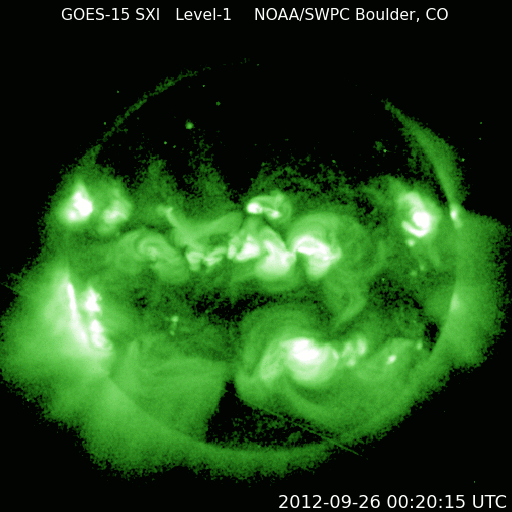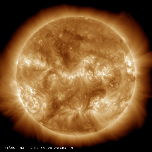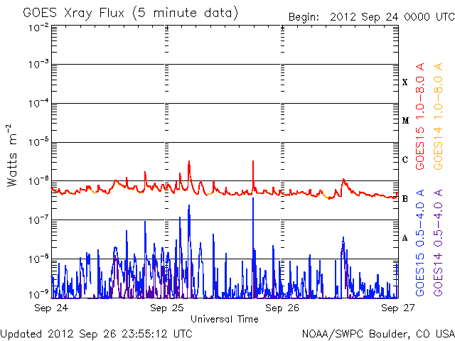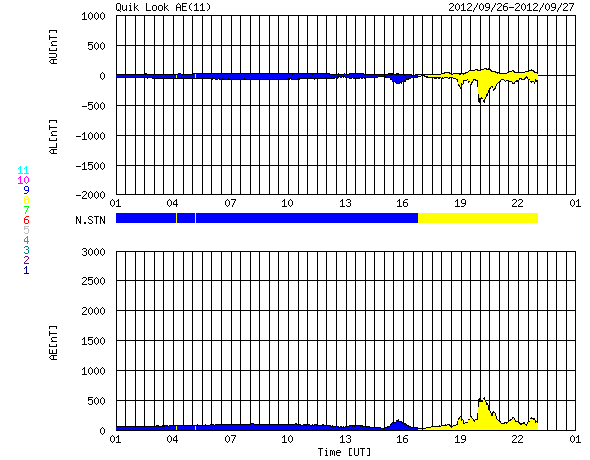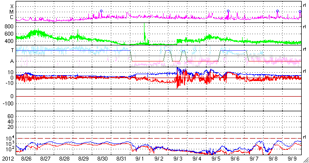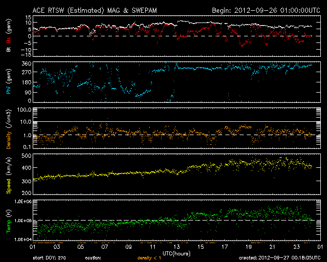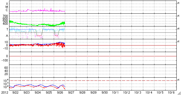 2012/ 9/27 09:19 更新 太陽のフレア活動は静穏ですが、黒点は多く見えています。 担当 篠原 太陽の南東から上がってきた黒点は、1582黒点群と番号が付きました。 西の1573群の下にも新しい黒点が現われているようで、 太陽は全体にわたって黒点群が見えています。 GOES衛星のX線カメラで、この1日間の太陽の様子を動画にしました。 フレアとしては、1582群でC1.2の小さなフレアが発生した程度ですが、 X線写真では、黒点の見える場所は明るく輝き、 小さな活動があちこちで起き続けています。 昨日、黒点が横一列に並んでいる写真を紹介しましたが、 X線で太陽全体を見ると、北半球と南半球それぞれに活動的な領域があり、 東西方向に明るい帯として伸びていることが分かります。 太陽風は、速度が少し上がっています。 昨日は、300km/秒近くまで下がっていたのですが、 ゆっくりと上昇して、現在は420km/秒と平均的な速度になっています。 この変化に対応するように、 磁場強度も、5nTから一時的に10nT近くまで高まりました。 現在は7nTと少し戻っています。 SDO衛星AIA193では、コロナホールも見えなかったので、 太陽風がこれ以上大きく高まることはないと思います。 基本的には、今後も穏やかな風が続くのではないでしょうか。 太陽風磁場が強まったことで、 南北成分が南に振れたときに、-5nTを超える変化が起きています。 このため、AE指数で500nTのオーロラ活動が発生しています。