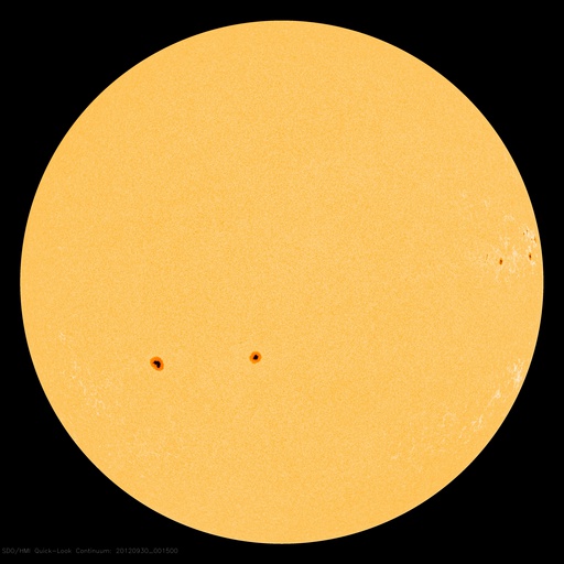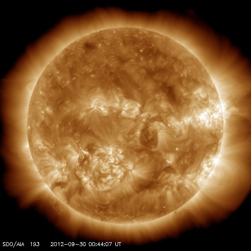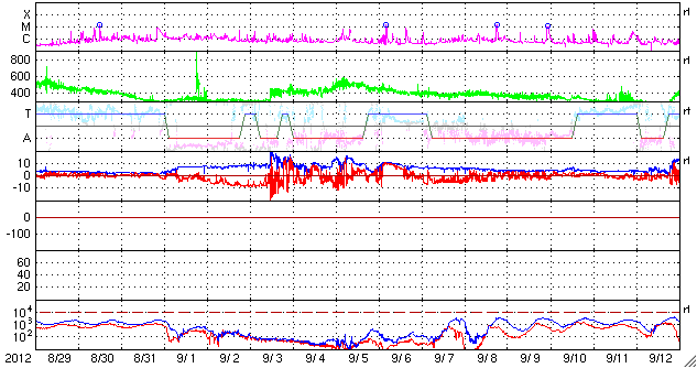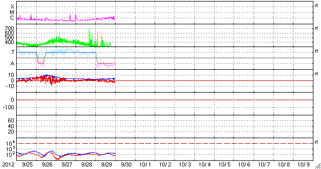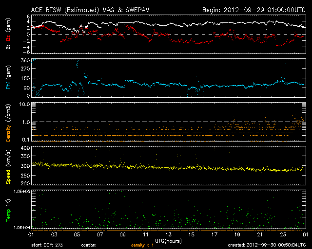 2012/ 9/30 09:52 更新 太陽風はかなり低速になっています。明日くらいに太陽風の乱れが到来しそうです。 担当 篠原 太陽風は、速度が更に下がり続け、 270km/秒とかなり遅い風になっています。 磁場強度も、昨日よりは少し高くなっていますが、 3〜4nTと弱い状態です。 27日周期の図を見ると、セクター境界がやって来て、 太陽風磁場の大まかな方向が「A」から「T」に変わっています。 それとともに、磁場の南北成分が南寄りに振れる様に変わり、 -2nTと小さい振幅の南向きが続いています。 AE指数のグラフの後半に小さな変化が見られているのは、 この磁場の方向の変化によるものでしょう。 昨日お知らせしたCMEによる太陽風の乱れが、 明日くらいに地球に到来すると思われます。 今夜以降、太陽風の変化に注目してください。 磁場の強まりがやって来て、太陽風磁場が大きく南に振れた場合、 オーロラの活動が激しくなったり、磁気嵐が発生する可能性があります。 今夜は中秋の名月で、満月のために空はかなり明るそうですが、 極域ではにぎやかなオーロラを楽しめるかもしれません。 太陽は、北西端近くの1575、1577黒点群の活動度が上がり、 C1の小さな小規模フレアが10回ほど発生しています。 GOES衛星のX線グラフも全体のレベルが少し上がっています。 更に活動度が高まるのかどうか、引き続き注目してください。 ![]() SDO衛星のAIA193カメラによる太陽コロナの様子 (c) SDO (NASA) ![]() SDO衛星による太陽の可視光写真。マウスの矢印を写真に重ねると、黒点番号付きの写真に切り替わります。 (c) SDO (NASA) ![]() ACEが観測した太陽風の磁場(1番上の枠、白線は全体の強度、赤線は南北成分) および、太陽風の密度(3番目の橙線)、速度(4番目の黄線) (c) NOAA/SWPC ![]() リアルタイムAE指数 下段のAEグラフの値が高くなると、オーロラ活動が活発化しています。 (c) 京都大学, NICT ![]() 27日の太陽周期に合わせたデータプロット 太陽が同じ面を地球に向けていた27日前の変化から、今後を予想することができます。 (c) 作図:宇宙天気ニュース