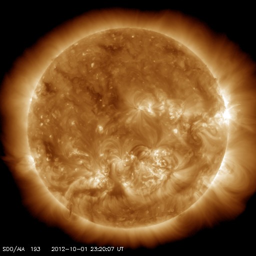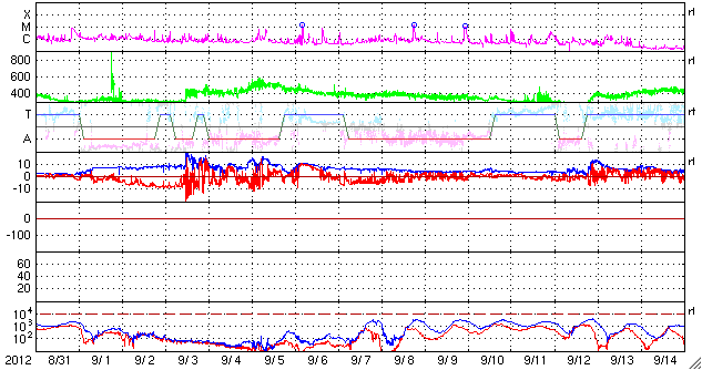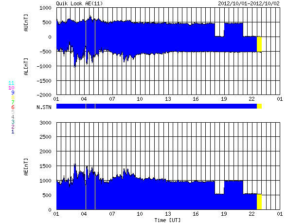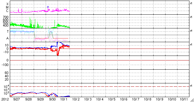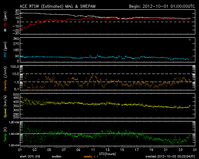 2012/10/ 2 09:22 更新 太陽風磁場の強い南向きによって、やや大きい磁気嵐が発生しました。現在の磁気圏は穏やかです。 担当 篠原 太陽風磁場の強まりは、昨日のニュース以降次第に弱まり、 昨夜のうちに、20nTから10nTへ下がっています。 磁場の南北成分の南向きへの強まりも、 昨日の昼、1日12時(世界時1日3時)以降は北向きに切り替わり、 現在まで継続しています。 このため、磁気圏の大きな乱れもこの頃までとなり、 京都大学のDst指数を参照すると、1日12時(世界時1日3時)に、 -143nTと最大の振れ幅(マイナス方向に変化が強まる)を記録しています。 やや大きい磁気嵐が発生しました。 AE指数は、データのエラーのためにグラフがおかしくなっていますが、 グラフの前半に激しい増減が記録されており、 この時間帯に活発な磁気圏活動が起きていたと考えられます。 昨日は、アラスカのライブカメラでオーロラが現れるのを待っていたのですが、 現地が夜を迎える前に太陽風磁場の南向きが終わってしまい、 期待していた活発なオーロラを見ることはできませんでした。 太陽風の速度は、400km/秒から330km/秒に下がり、 低速の傾向が強まっています。 CMEによる太陽風の乱れは終って、穏やかな風に戻りつつあります。 太陽は、西の端で、 C4.8が2回、その他にC1〜2のフレアが6回ほど発生しています。 活動的な領域は、もうすぐ向こう側に回ってしまうので、 この後の太陽は穏やかになりそうです。