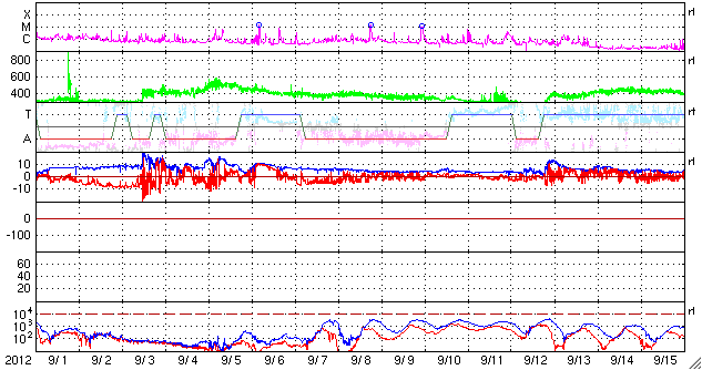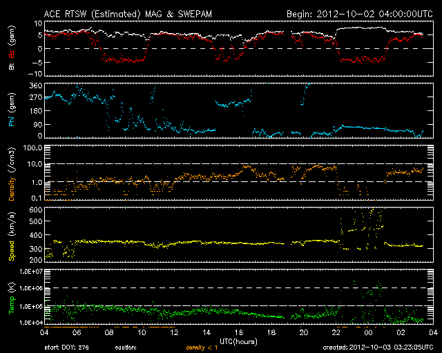 - 2012/10/ 1 09:38 CMEによる太陽風の乱れが到来しました。磁場が大きく南向きに振れていて、磁気圏は大きく乱れそうです。