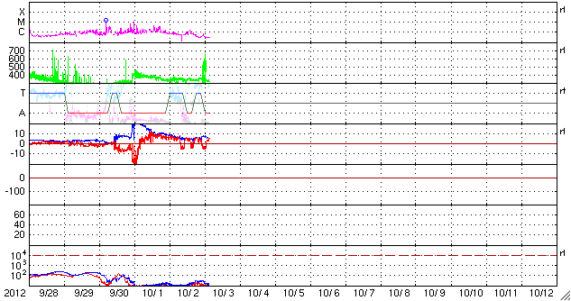 - 2012/10/ 2 09:22 太陽風磁場の強い南向きによって、やや大きい磁気嵐が発生しました。現在の磁気圏は穏やかです。