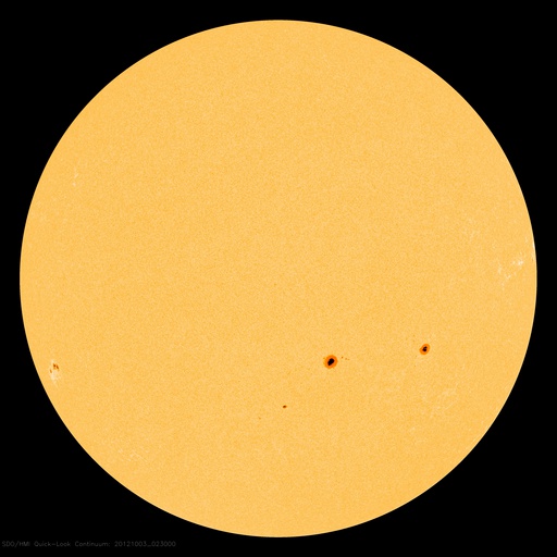 SDO衛星による太陽の可視光写真。マウスの矢印を写真に重ねると、黒点番号付きの写真に切り替わります。