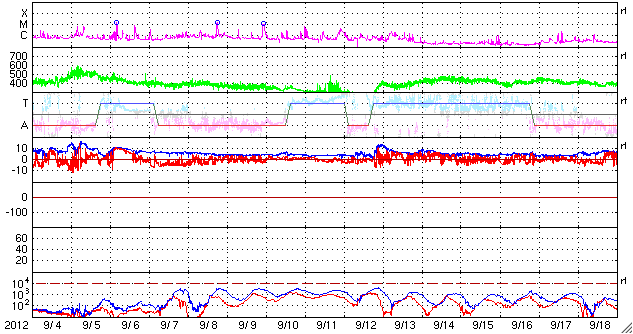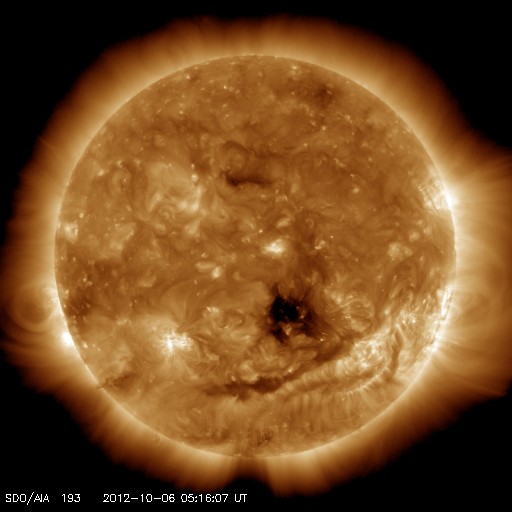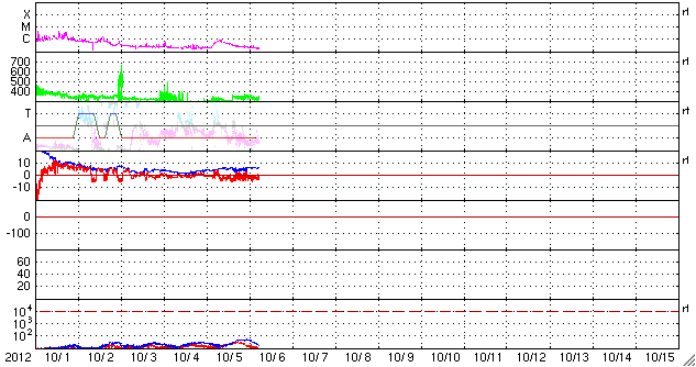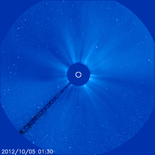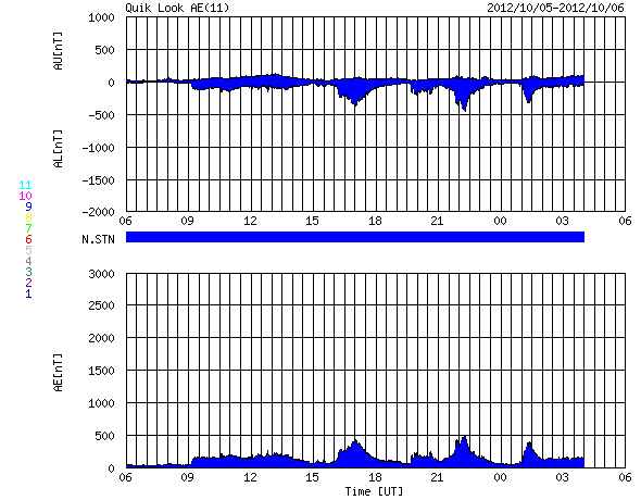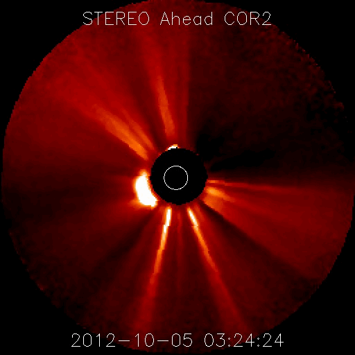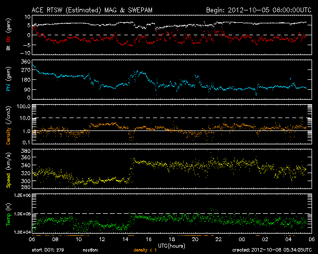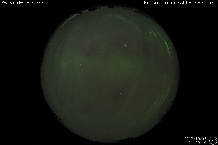 2012/10/ 6 14:32 更新 太陽でCMEが発生しました。太陽風磁場が南寄りになり、オーロラが発生しています。 担当 篠原 太陽の南西部の1584黒点群で、B7.8と強度は弱いですが、 長時間変化が続くタイプのフレアが発生しました。 これに伴って、CME(太陽ガスの噴出現象)が発生しています。 SOHO衛星LAASCO C3の動画を見ると、 右下方向を中心に太陽を包むように白いガスが噴き出しています。 その様子は、STEREO Ahead衛星のCOR2カメラでも見ることができます。 地球のある左方向へ、太陽コロナのガスが噴き出しています。 このCMEによる太陽風の小規模の乱れが、 噴出から3〜4日後の8日夜から9日にかけて、 地球に到来する可能性があります。 速度の変化は弱いと思いますが、 磁場強度が強まって大きく南向きに振れると、 磁気圏のオーロラ活動は活発化します。 先ずは、ACEによる太陽風の変化に注目してください。 太陽では、この他には特にフレア活動はなく、穏やかです。 太陽風は、320〜350km/秒と遅い風が続いています。 磁場強度は、5nT前後と平均的な強さで安定しています。 その中で、磁場の南北成分は南向きの傾向が続いています。 このため、磁気圏ではオーロラ活動が発生し、 AE指数で300〜500nTの小規模の変動が、数時間おきに発生しています。 その様子を、昭和基地の全天カメラの動画でご覧ください。 雲越しの写真で、少し残念ですが、 オーロラの輝きが次々に空に現われています。 動画の最後は、夜明けに向かう青空です。 例年の様子だと、昭和基地の全天カメラ撮影は残り10日程です。 最初に紹介したCMEの乱れで、 最後を飾るようなにぎやかなオーロラが現れるでしょうか。 ![]() SOHO衛星LASCO C3による、太陽を包むように広がるハロー型のCME。 (c) SOHO (ESA & NASA)、 (動画加工 : 宇宙天気ニュース) ![]() STEREO Ahead衛星COR2カメラによる、地球方向へ噴き出すCME。 (c) STEREO (NASA)、 (動画加工 : 宇宙天気ニュース) ![]() 南極の昭和基地で、全天カメラにより撮影されたオーロラ。 (c) 国立極地研究所、(動画加工 : 宇宙天気ニュース) ![]() SDO衛星のAIA193カメラによる太陽コロナの様子 (c) SDO (NASA) ![]() SDO衛星による太陽の可視光写真。マウスの矢印を写真に重ねると、黒点番号付きの写真に切り替わります。 (c) SDO (NASA) ![]() GOES衛星の太陽X線データ (c) NOAA/SWPC ![]() ACEが観測した太陽風の磁場(1番上の枠、白線は全体の強度、赤線は南北成分) および、太陽風の密度(3番目の橙線)、速度(4番目の黄線) (c) NOAA/SWPC ![]() リアルタイムAE指数 下段のAEグラフの値が高くなると、オーロラ活動が活発化しています。 (c) 京都大学, NICT ![]() 27日の太陽周期に合わせたデータプロット 太陽が同じ面を地球に向けていた27日前の変化から、今後を予想することができます。 (c) 作図:宇宙天気ニュース