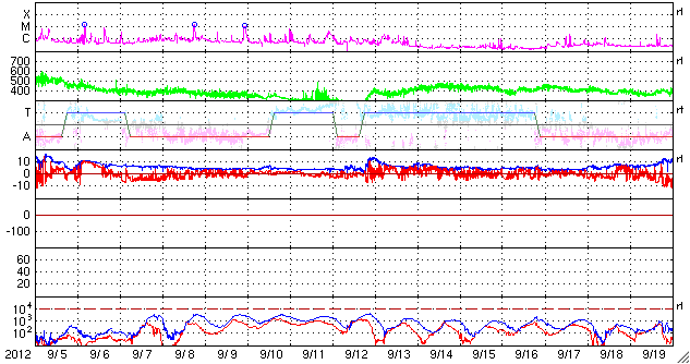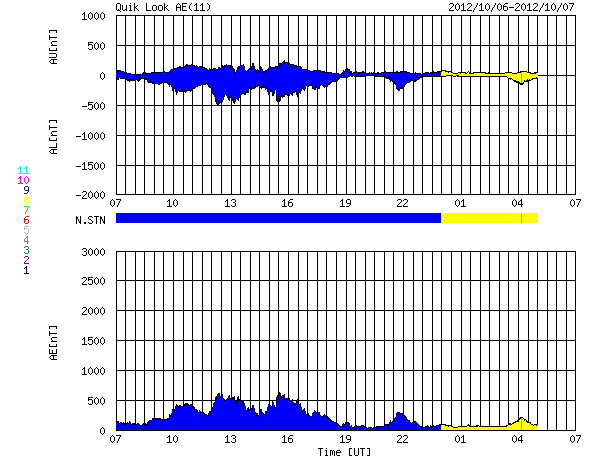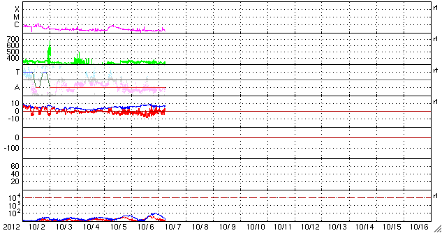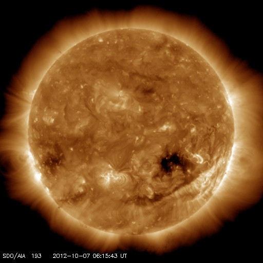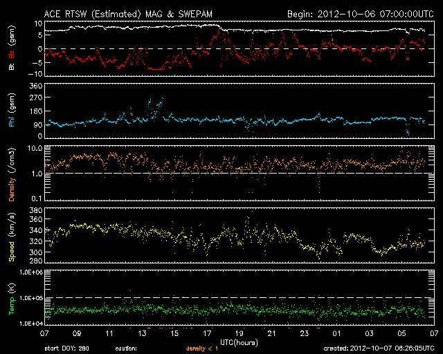 2012/10/ 7 15:27 更新 太陽風は低速です。明日以降、太陽風に乱れが発生しそうです。 担当 篠原 太陽風は、340km/秒から320km/秒と、 速度の遅い風が続いています。 磁場強度は、7nT前後と少し強まっています。 そして、磁場の南北成分が南寄りに推移していて、 -5nTを超える南向きの時間帯もありました。 このため、磁気圏ではオーロラの活動が高まり、 AE指数で500nTの変化が半日ほど続いています。 現在は、磁場の南寄りの傾向が弱まり、 オーロラの活動は静かになっています。 SDO衛星AIA193を見ると、 太陽の南半球のコロナホールが、 だいぶ西側に移動しています。 明日の8日か、9日あたりから、 この領域の影響が太陽風に現れそうです。 一方、昨日お知らせしたCMEの乱れも 地球に向かっていて、同じ頃に到来しそうです。 二つが重なって、やや大きな変化が見られるかもしれません。 太陽風のデータとともに、 オーロラのライブカメラなどにも注目して下さい。 太陽は、特にフレアもなく穏やかです。 東の端から、新しい黒点が現れています。