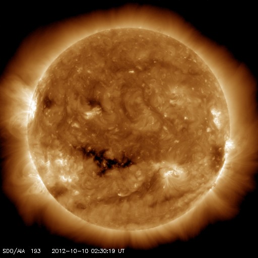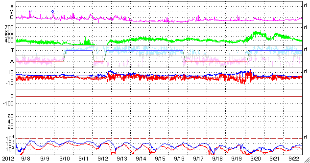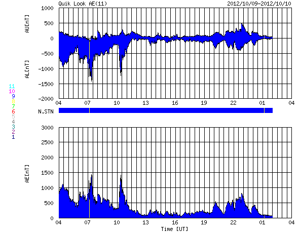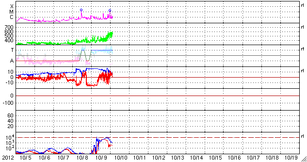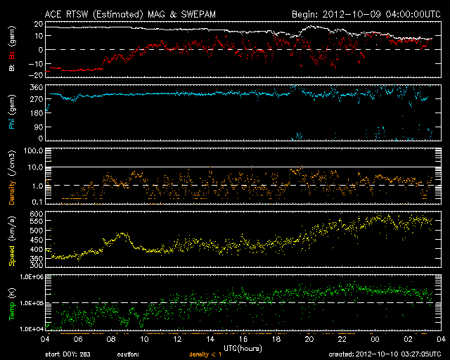 2012/10/10 12:28 更新 太陽風磁場の乱れは終わり、高速風に変わっています。イエローナイフのオーロラ写真をどうぞ。 担当 篠原 カナダ・イエローナイフのYoshi Otsukaさんより、 昨夜のオーロラの素晴らしい写真が届きました。 Otsukaさんによると、この時期は季節の変わり目のため、 天候がかなり不安定なのだそうですが、 昨夜は、夜に5時間ほど空が晴れて、 オーロラを観望することができたそうです。 Otsukaさんからは、これまでに何度も オーロラの写真を送っていただいていることもあり、 再び北半球のオーロラシーズンが始まったのだなと強く感じます。 撮影したばかりの美しい写真を、どうもありがとうございます。 太陽風は、磁場の乱れが弱まって、今度は高速の風に変わっています。 昨日到来していた15nTを越える磁場の強まりは、 今日に入った頃から少しずつ弱まって、 現在は8nTとまだ強めですが、普通の状態に戻りつつあります。 磁場の大きな南向きも、昨夕、9日17時(世界時9日8時)頃に終わり、 以降は、0nTをはさんで南北に振れています。 磁気圏の活動は、太陽風磁場の南向きが強かった頃は、 AE指数で1000nTを超える大きな変化をしていましたが、 以降は変化が弱くなっています。 昨夜は、昭和基地の全天カメラもオーロラの輝きを捉えていたのですが、 雲が空を覆っていて、写真全体がぼんやりと光っているだけでした。 現在の太陽風は、速度が550km/秒に上がって、高速状態になっています。 SDO衛星AIA193で見えていたコロナホールの影響が来ているのでしょう。 明日、明後日くらまで、速度は高めの状態が続くかもしれません。 太陽では、今朝、10日8時半(世界時9日23時半)のM1.7の中規模フレアと、 多数のCクラスフレアが東の端で発生しています。 可視光写真を見ると、北東(左上)に大きな黒点が見えていますが、 南東(左下)からも、新しい活動領域が顔を出しそうです。 ![]() YOSHI OTSUKAさんにより、カナダ・イエローナイフで世界時9日17時17分に撮影されたオーロラ。 (c) YOSHI OTSUKA 氏 ![]() YOSHI OTSUKAさんにより、カナダ・イエローナイフで世界時9日18時53分に撮影されたオーロラ。 (c) YOSHI OTSUKA 氏 ![]() YOSHI OTSUKAさんにより、カナダ・イエローナイフで世界時9日18時56分に撮影されたオーロラ。 (c) YOSHI OTSUKA 氏 ![]() 南極の昭和基地の全天カメラ画像。雲越しにオーロラの光が見えています。 (c) 国立極地研究所 ![]() SDO衛星のAIA193カメラによる太陽コロナの様子 (c) SDO (NASA) ![]() SDO衛星による太陽の可視光写真。マウスの矢印を写真に重ねると、黒点番号付きの写真に切り替わります。 (c) SDO (NASA) ![]() ACEが観測した太陽風の磁場(1番上の枠、白線は全体の強度、赤線は南北成分) および、太陽風の密度(3番目の橙線)、速度(4番目の黄線) (c) NOAA/SWPC ![]() リアルタイムAE指数 下段のAEグラフの値が高くなると、オーロラ活動が活発化しています。 (c) 京都大学, NICT ![]() 27日の太陽周期に合わせたデータプロット 太陽が同じ面を地球に向けていた27日前の変化から、今後を予想することができます。 (c) 作図:宇宙天気ニュース