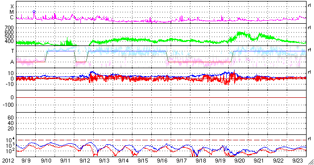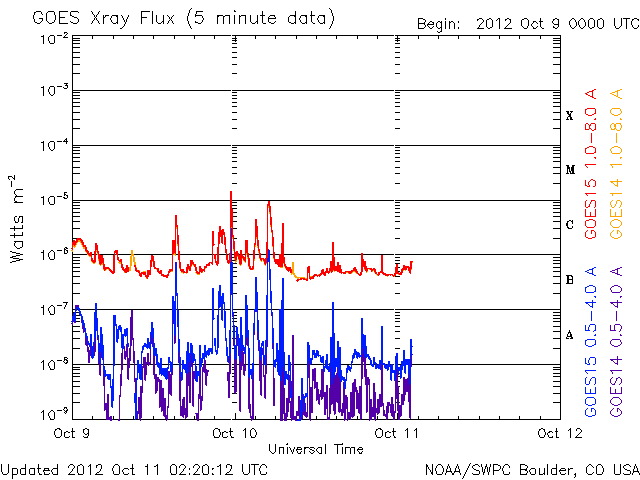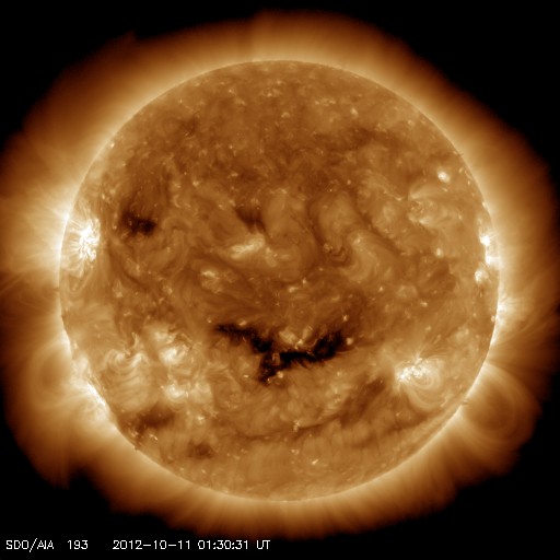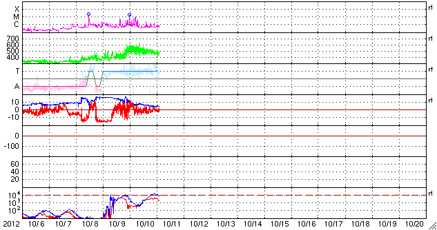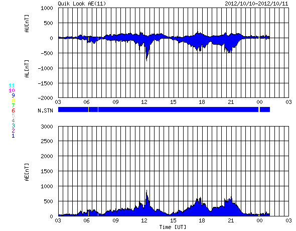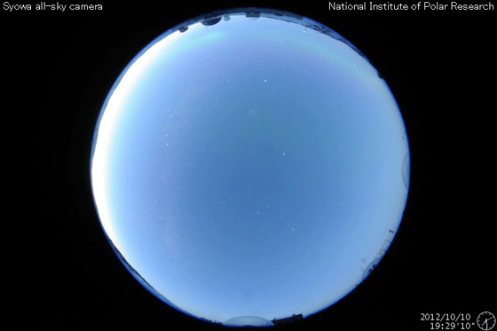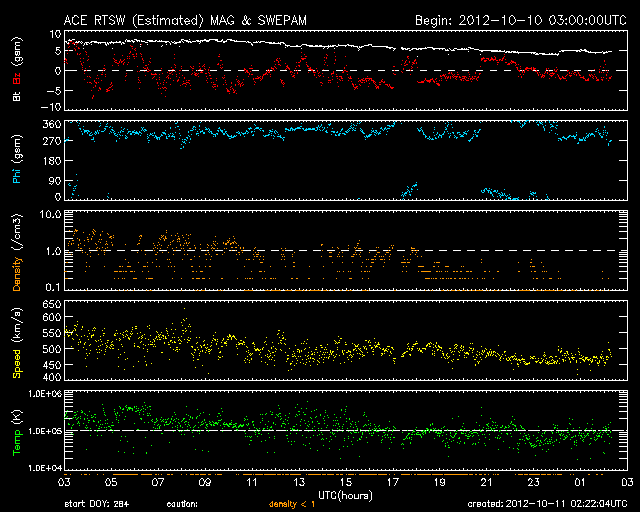 2012/10/11 11:23 更新 高速の太陽風は終わりに近づいています。昭和基地のオーロラをご覧ください。 担当 篠原 太陽風の速度は、550km/秒から470km/秒へゆっくりと下がり、 やや高速の状態へ下がっています。 高速太陽風は、昨日の午前中がピークだった様です。 磁場強度も、7nTから4nTへゆっくりと下がり、 平均的な強度に戻っています。 磁場の南北成分は、振れ幅は小さくなっていますが、 比較的南寄りで推移しています。 このため、AE指数を見ると、500nTを越える中規模の活動が 断続的に発生しています。 南極・昭和基地の全天カメラでオーロラの活動が撮影されていたので、 動画を紹介します。 世界時19時半から3時間程度の動画ですが、 始めの頃には夕暮れ、終わりには夜明けと、あっと言う間に空が明るくなっています。 例年の様子では、昭和基地の撮影は今週末くらいまでの様です。 SDO衛星AIA193を見ると、中央部の南半球側に、 コロナホールが東西方向に広がっています。 2日ほどすると、この領域からの影響で、太陽風の速度が高まるかもしれません。 27日前の前周期よりもコロナホールは広がっているので、 前周期は見られなかった高速風が到来する可能性があります。 オーロラの発生など注目してください。 太陽は、昨日のニュースの後も、 M1.0やCクラスのフレアが東端で発生しています。 しかし、昨夜以降は発生頻度が下がって、落ち着いています。 ひと休みして再び活動を強めることも良くあるため、 今後の様子に注目してください。 また、放射線帯の高エネルギー電子が増加しています。 青線のGOES-15は、10,000の線を超えています。 ![]() 南極の昭和基地で、全天カメラにより撮影されたオーロラ。夕暮れと夜明けが近くなっています。 (c) 国立極地研究所、(動画加工 : 宇宙天気ニュース) ![]() SDO衛星のAIA193カメラによる太陽コロナの様子 (c) SDO (NASA) ![]() SDO衛星による太陽の可視光写真。マウスの矢印を写真に重ねると、黒点番号付きの写真に切り替わります。 (c) SDO (NASA) ![]() ACEが観測した太陽風の磁場(1番上の枠、白線は全体の強度、赤線は南北成分) および、太陽風の密度(3番目の橙線)、速度(4番目の黄線) (c) NOAA/SWPC ![]() リアルタイムAE指数 下段のAEグラフの値が高くなると、オーロラ活動が活発化しています。 (c) 京都大学, NICT ![]() 27日の太陽周期に合わせたデータプロット 太陽が同じ面を地球に向けていた27日前の変化から、今後を予想することができます。 (c) 作図:宇宙天気ニュース