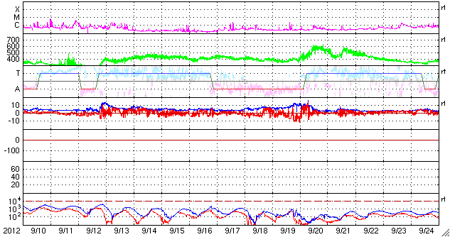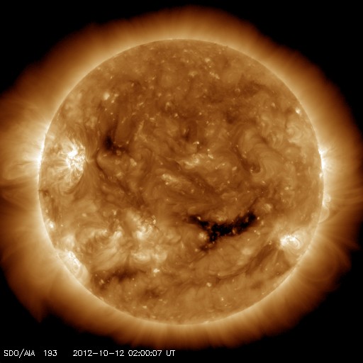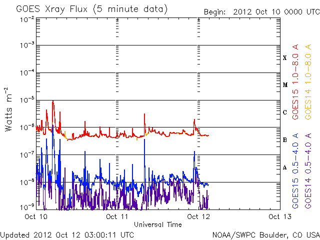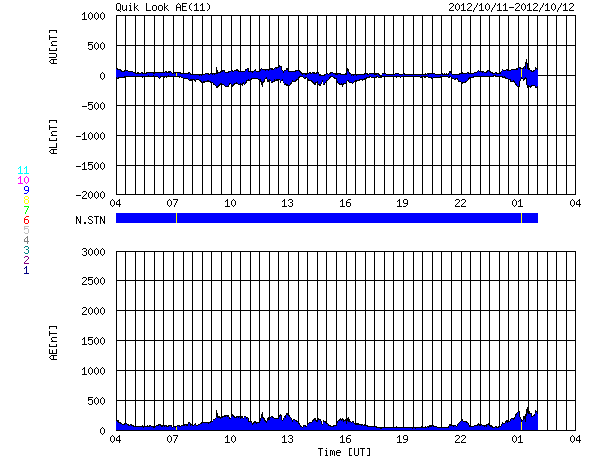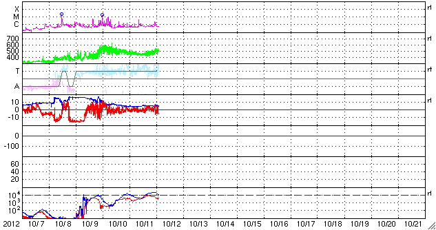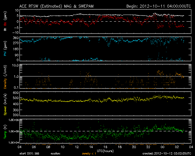 2012/10/12 12:03 更新 ムルマンスクのオーロラ写真をどうぞ。太陽風は500km/秒の高速風が続いています。 担当 篠原 ロシア・ムルマンスクの福島さんより、 11日未明に撮影されたオーロラの写真が届きました(撮影、ジガーノフ氏)。 昨日のニュースで紹介したオーロラの動画に近い時間帯の撮影の様です。 ムルマンスク州のヒビノ山脈の麓に現れたオーロラとのことで、 遠くに雪を被った白い峰がのぞいています。 オーロラの輝きに透明感を感じる素敵な写真です。 どうもありがとうございました。 これから雪とオーロラの写真へと変わって行くのですね。 昨日の時点で500km/秒台を割っていた太陽風の速度は、 それ以上下がることはなく、今朝になって500km/秒へと再び高まっています。 磁場強度は、5nTと平均的な強度を保っています。 磁場の南北成分は、0nTから比較的北寄りになっています。 このため、磁気圏の活動は弱まって、 AE指数のグラフは小さな変化が見られる程度です。 コロナホールが通り過ぎて、 太陽風の速度は一旦下がるかと思っていたのですが、 SDO衛星AIA193を見ると、次のコロナホールが西側へ進んでいて、 このままこの領域の影響が始まるかもしれません。 明日以降も、500km/秒台程度の高速太陽風が続く可能性があります。 太陽は、東端の南半球と北半球の両方から新しい黒点が顔を出しています。 しかし、フレアの発生は少なくなっていて、 1589群で起きたC4.6のフレアが目立つ程度です。 しかし、これら東端の3つの活動的な領域については、 今後も注目してください。 放射線帯の高エネルギー電子は、高まった状態が続いています。 赤線のGOES12も、10,000の線に近づいています。