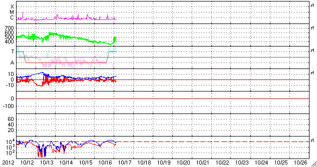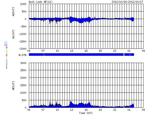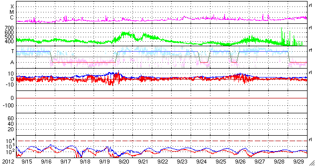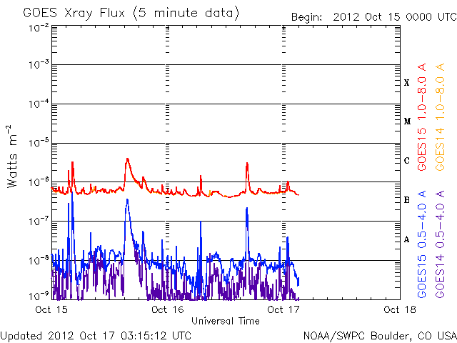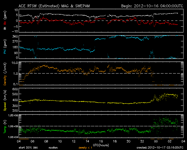 2012/10/17 12:17 更新 太陽風の速度が再び高速になりました。太陽は穏やかです。 担当 篠原 今朝、17日9時(世界時17日0時)頃から、 太陽風の速度が上がり始め、 400km/秒から500km/秒と高速風に変わっています。 27日周期の図で、前周期の太陽風速度に見られた(9月20日) 速度の高まりが回帰してきた様です。 磁場強度も、3nTから6nTへわずかですが強まっています。 この後、速度はもう少し高まりを見せるかもしれません。 磁場の南北成分は、速度の高まり以降南寄りに振れています。 このため、磁気圏の活動がある程度高まるかもしれません。 ここまでのAE指数は、200〜300nTの小さな変化が発生しています。 太陽は、1589黒点群でC3.3、1591黒点群でC1.8と 小規模のフレアが発生した程度で、 全体としては穏やかです。 放射線帯の高エネルギー電子は、 今日は両方のGOES衛星で10,000に達しています。 現在の太陽風の乱れの影響で、 この後、大きく減少する可能性もあります。