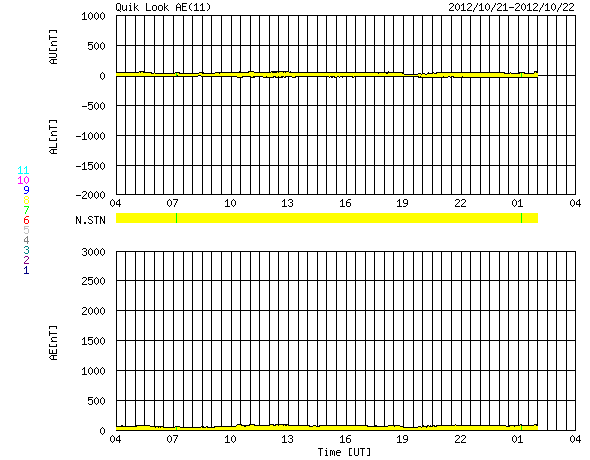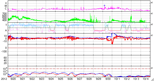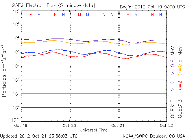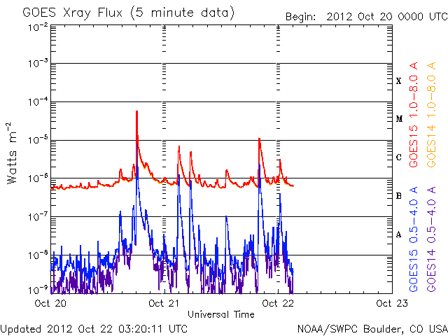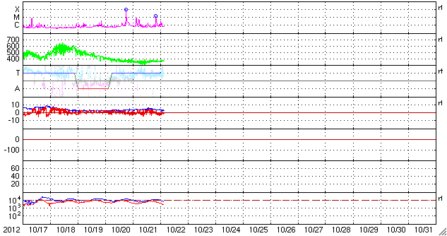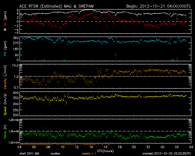 2012/10/22 12:23 更新 1598黒点群ではフレアが続いています。太陽風は低速で、磁気圏も穏やかです。 担当 篠原 1598黒点群の活動が続いています。 昨日のM9.0以降も、 21日12時(世界時21日3時)に、C7.8、 21日15時(世界時21日6時)に、C5.6、 22日5時(世界時21日20時)に、M1.3、 22日9時半(世界時22日0時半)に、C3.4などのフレアを起こしています。 フレアの規模は小さくなっていますが、 しばらく休んで、再び活動が強まるという変化もよく見られます。 引き続き、この黒点群の活動に注目してください。 今後は、太陽の中心に近づいて行くので、 大きな活動を起こしたときに、CMEの影響が地球へ及びやすくなります。 太陽風は、360km/秒と低速の風で安定しています。 磁場強度は、4nT前後とやや弱めです。 磁気圏は静穏で、AE指数のグラフは全く変化していません。 太陽風は、穏やかな風がしばらく続きそうです。 放射線帯の高エネルギー電子は、高まった状態が続いています。 磁気圏が静かだと、こちらはゆっくりと減って行きます。