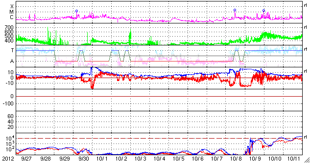 - 2012/10/26 10:59 太陽は静かになってきました。太陽風は低速で、磁気圏も静かです。