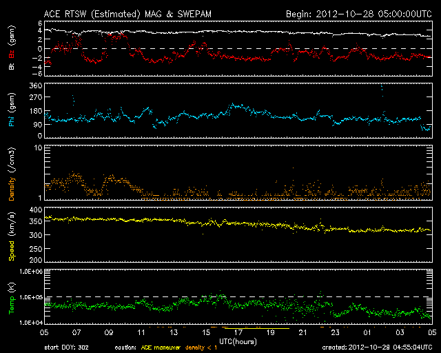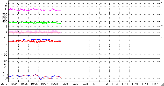 - 2012/10/28 11:04 太陽は穏やかです。太陽風も低速で、磁気圏も穏やかです。