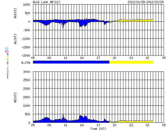 下段のAEグラフの値が高くなると、オーロラ活動が活発化しています。