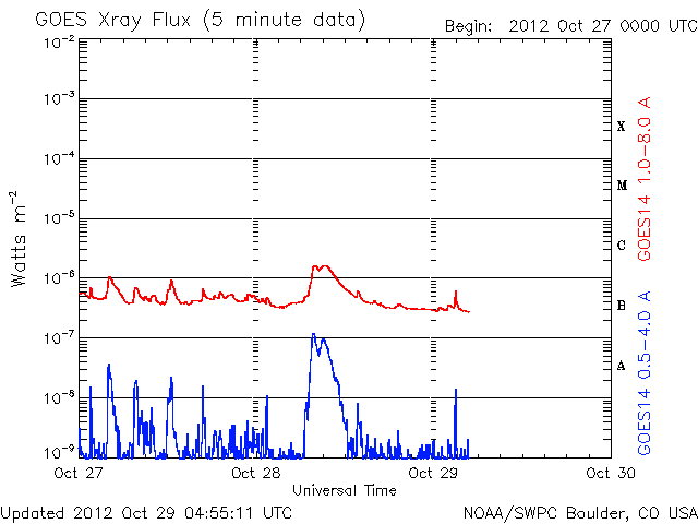 - 2012/10/27 14:08 太陽は低速の風が続いています。太陽は、C1のフレアが続いています。