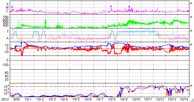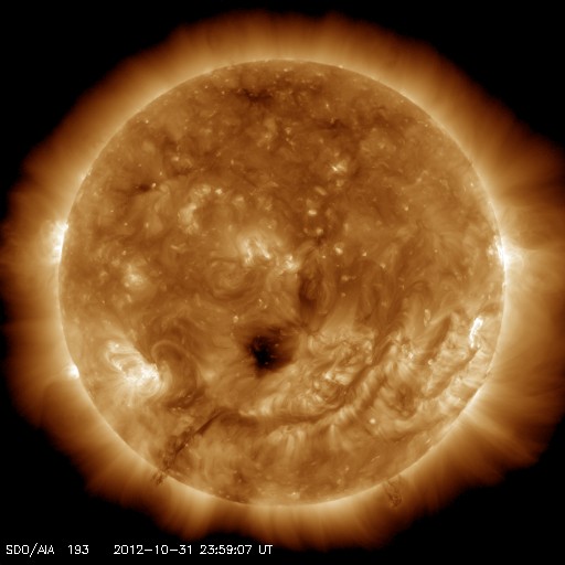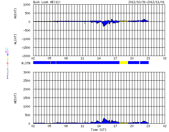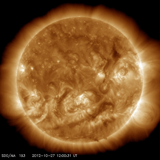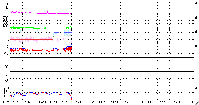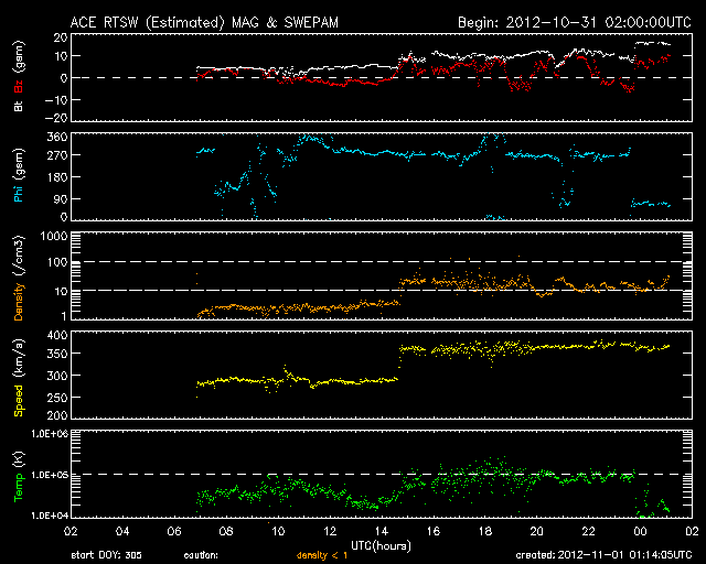 2012/11/ 1 10:12 更新 CMEによる太陽風の乱れが到来しました。今のところ磁気圏への影響は小さいです。 担当 篠原 10月31日23時半(世界時31日14時半)に、 太陽風の急な変化が到来しました。 速度は、300km/秒から350km/秒へ、 磁場強度は、5nTから10nTヘ、プラズマ密度は、4個/cm^3から20個/cm^3へ それぞれ上昇しています。 また、磁場強度は先ほどからもう一段強まって、15nTに高まっています。 速度の変化は小幅で、上昇した後も低速風の状態ですが、 磁場強度はなかなか強まっています。 変動の原因は、27日に発生したCME(太陽ガスの放出現象)だと思われます。 その時の様子を、SDO衛星、STEREO Ahead衛星、SOHO衛星の画像で紹介します。 はっきりとは見えないのですが、 太陽の中央から少し北西の部分でフィラメントの噴出が発生して(SDO衛星)、 CMEの噴出になっている様です。 STEREO Ahead衛星は、太陽を右から見ているので、 地球は写真の左方向にあります。 そちらに向かって、ガスが噴き上がっています。 そして、SOHO衛星では、ガスが淡くて見にくいですが、 太陽全体を包むように広がるハロー型のCMEになっています。 このCMEが、4日かけて地球に到来したようです。 今日いっぱいくらいかかって、乱れが通り過ぎて行くのではないでしょうか。 地球への影響度を決める、太陽風磁場の南北成分は、 比較的北寄りに推移しています。 特に、10nT程度まで大きく振れるときは北側を向いています。 このため、今のところ地球への影響は小さく、 AE指数のグラフは小さな変化が見られる程度です。 今後、磁場の方向が北寄りから南寄りに切り替わって、 大きく南に振れるようになると、 オーロラの活動が急に強まる可能性があります。 その場合は、ライブカメラにも注目してください。 現在の擾乱が通過した後は、太陽風は再び穏やかな低速風に戻るでしょう。 太陽は、西の端の方で、C1のフレアが2回発生した程度で、 穏やかです。 黒点の見え方も、だいぶ寂しくなっています。 SDO衛星AIA193の写真の中央には、 小さなコロナホールが見えています。 3〜4日後の、11月4、5日くらいに影響がやって来る可能性があります。