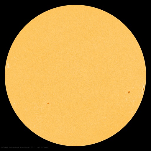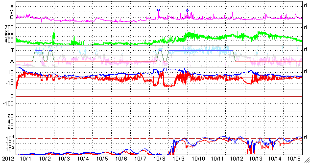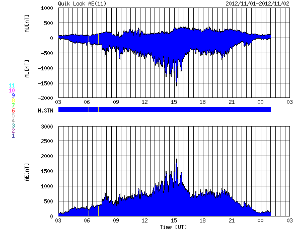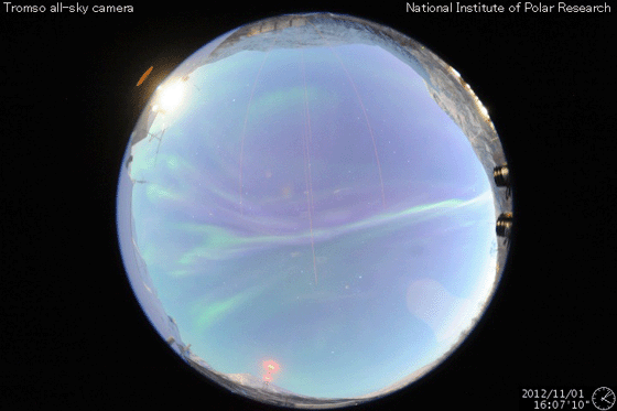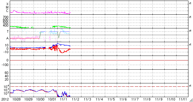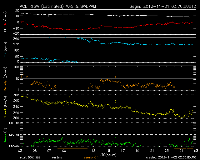 2012/11/ 2 11:32 更新 太陽風磁場が南に大きく振れ続け、磁気圏の活動が強まりました。現在は穏やかです。 担当 篠原 昨日の午後、11月1日14時(世界時1日5時)頃から、 太陽風磁場の南北成分が南向きに切り替わり、 以降、半日にわたって -10nT前後の強い南向きが続きました。 このため、磁気圏の活動度が高まり、 AE指数では、1500nTに達する大きな変動が発生しています。 国立極地研究所による、ノルウェー・トロムソの 全天カメラによるオーロラの様子を、動画で紹介します。 月明かりがあるため空全体が明るくなっていますが、 オーロラのにぎやかな変動が写っています。 また、京都大学WDCのDst指数では -70nT近い減少が発生し、 弱い磁気嵐が起きています。 太陽風の速度は、380km/秒から300km/秒へ下がり、 再びかなり遅い風に変わっています。 15nTまで強まっていた磁場強度も、 現在は8nTと、平均よりやや強いくらいにまで下がっています。 CMEによる太陽風磁場の乱れは、終わりに近づいています。 南に大きく振れていた磁場の南北成分は、0nT付近に戻っています。 このため、磁気圏への影響は、現在は小さくなっています。 磁気圏も、この後は穏やかになるでしょう。 太陽は、目立ったフレアの発生もなく、 穏やかな状態です。