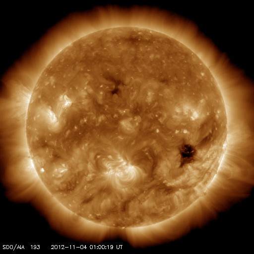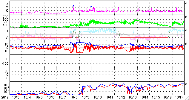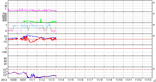 2012/11/ 4 10:19 更新 太陽風は低速で、磁気圏も穏やかです。1日のムルマンスクのオーロラ写真をどうぞ。 担当 篠原 ロシア・ムルマンスクの福島さんより、 1日の夜に撮影されたオーロラの写真が届きました (撮影、ムルマンスクの写真家ラーク氏)。 CMEによる擾乱がやって来て、太陽風の磁場が大きく南を向き続けた夜です。 この日、昼間のムルマンスクは比較的暖かかったそうですが、 夜になって急激に冷え込み、20〜30m先も見えないような濃霧になったそうです。 その濃い霧を逃れて、ラークさんが撮影に成功した写真だそうです。 写真の下半分を覆う白いガスは、街を覆った濃霧なのでしょう。 月光に照らされて、輝いています。 上空を漂うオーロラの緑色の光と組み合わさって、とても幻想的な雰囲気です。 また、手前の薄く雪を被った地面が、北極圏の寒さを感じさせてくれます。 気象条件が組み合わさると、こんな素敵な写真ができ上がるのですね。 その代わり、撮影のご苦労もたいへんなことだと思います。 美しい光景を、どうもありがとうございます。 太陽風は、4日23時(世界時4日14時)に、 速度が300km/秒から340km/秒へ上昇しています。 変化としては小さく、高まった後も太陽風は低速の状態です。 この変化とともに磁場強度も5nTヘ高まっていますが、 こちらも平均的な強度に戻ったくらいの変化です。 SDO衛星AIA193の太陽コロナ写真を見ると、 南半球側の丸いコロナホールが、西にだいぶ移動しています。 今回の太陽風の変化はこのコロナホールに関係しているのかもしれません。 あるいは、これから別の速度の高まりがやって来るのかもしれません。 その場合も、変化としては小規模だと思いますが、 もうしばらく太陽風の様子に注目してください。 磁気圏も静穏な状態が続いています。 AE指数には300nTほどの小さな変化が発生していますが、 これは、速度が高まった頃に、 太陽風の磁場が-4nTと南向きに振れた事によるものです。 その後は、落ち着いた状態になっています。 太陽の活動も静かです。 目立ったフレアの発生はなく、黒点もだいぶ寂しくなっています。 SOHO衛星LASCO C3によると、 太陽の右側全体に広がるCMEが発生しています。 STEREO Ahead衛星のデータによると、 太陽の裏側で発生した現象です。 地球への影響はありません。 ![]() ムルマンスクの濃霧を逃れて捉えたオーロラ。福島さんより。撮影はラーク氏。 (c) 福島氏、ラーク氏 ![]() SDO衛星のAIA193カメラによる太陽コロナの様子 (c) SDO (NASA) ![]() SDO衛星による太陽の可視光写真。マウスの矢印を写真に重ねると、黒点番号付きの写真に切り替わります。 (c) SDO (NASA) ![]() ACEが観測した太陽風の磁場(1番上の枠、白線は全体の強度、赤線は南北成分) および、太陽風の密度(3番目の橙線)、速度(4番目の黄線) (c) NOAA/SWPC ![]() リアルタイムAE指数 下段のAEグラフの値が高くなると、オーロラ活動が活発化しています。 (c) 京都大学, NICT ![]() 27日の太陽周期に合わせたデータプロット 太陽が同じ面を地球に向けていた27日前の変化から、今後を予想することができます。 (c) 作図:宇宙天気ニュース