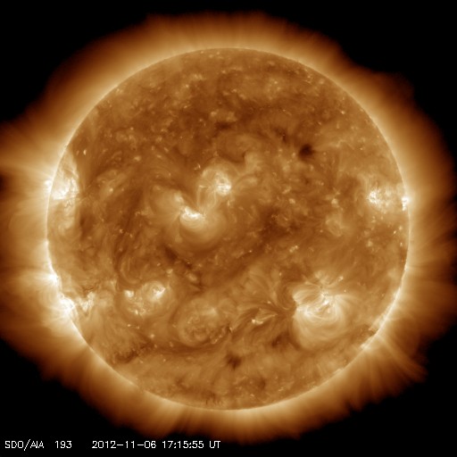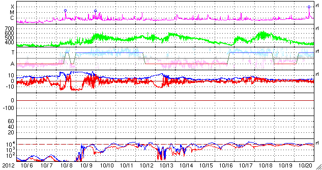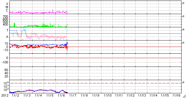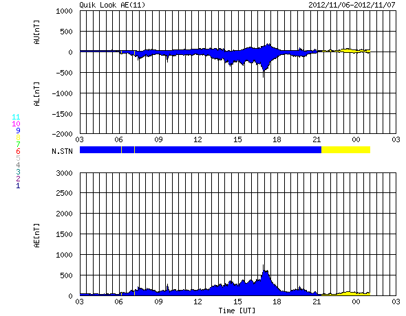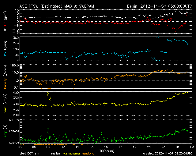 2012/11/ 7 11:25 更新 太陽風の速度と磁場強度が少し高まっています。太陽は東端で小さなフレアが起きています。 担当 篠原 太陽風は、昨日以降も300km/秒の低速の風が続いていましたが、 今朝、7日8時(世界時6日23時)頃から上昇を始め、 380km/秒と平均的な速度まで上がっています。 また、磁場強度も上昇を始め、 それまでの5nTから最大15nTに達したあと、 現在は10nTに強まった状態です。 太陽風のデータを見ると、磁場の大まかな方向が 「A(太陽から地球方向)」から「T(地球から太陽方向)」に切り替わる、 セクター境界が来ている様です。 今回の太陽風の変化は、この切り替わりに伴って発生した変化かもしれません。 一方、11月3日と4日に太陽で弱いCMEが発生していました。 この影響が3〜4日を経て、地球に到達したのかもしれません。 太陽風の磁場強度が強まって、南北成分が大きく南に振れる変化をしています。 最後のデータは0nTに戻っていますが、今後も南向きに強く振れる可能性があり、 その場合、オーロラの活動が高まる可能性があります。 太陽風磁場の様子と見比べながら、 この後のアラスカのライブカメラに注目してみてください。 掲載しているAE指数のグラフには、500nTに達する変化が記録されていますが、 これは、太陽風の高まりがやって来る前の変化です。 今後のAE指数に変化が発生するでしょうか。 太陽風の速度は、もうしばらく上昇するかもしれません。 しかし、これから大きく高まることはないと思います。 明日か明後日には、再び低速の穏やかな風に戻っているかもしれません。 太陽は、昨日のC2.3に続いて、東端でBクラスの小さな活動が続いています。 南東の端から1509黒点群が姿を現しましたが、 この後、北東側からも活動的な領域が現われそうです。