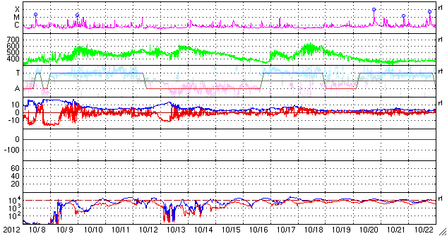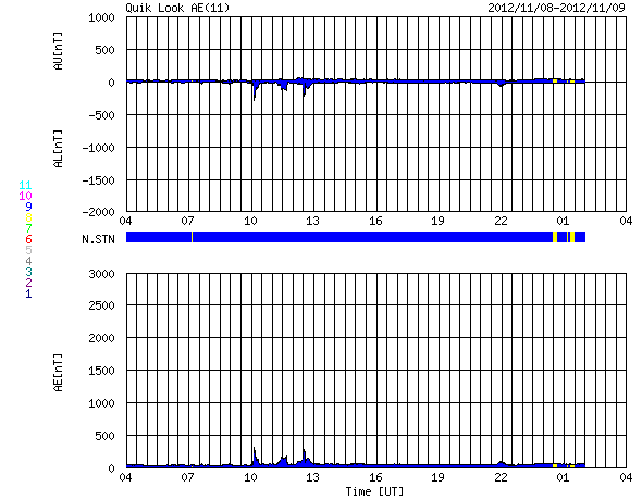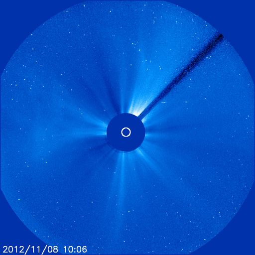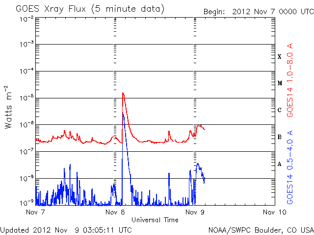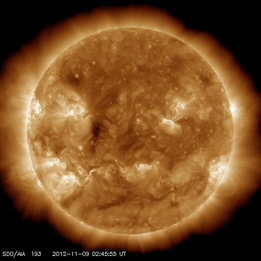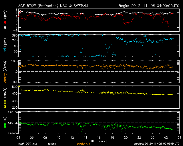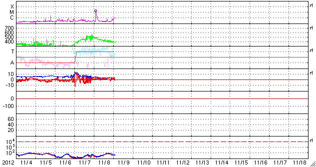 2012/11/ 9 12:10 更新 太陽でフレア、CMEの発生が続いています。太陽風は平均的な速度に戻りました。 担当 篠原 太陽の活動が少し高まっています。 昨日のニュース更新の直後、8日11時(世界時8日2時)に、 太陽の北東の端でM1.7の中規模フレアが発生しました。 発生地点は、顔を見せたばかりの1611黒点群です。 そして、今朝、9日9時(世界時9日0時)には、 今度は太陽の南東端でC1.0のフレアが発生しています。 どちらもCMEを伴っていて、今朝のフレアについて、 GOES衛星のX線カメラとSOHO衛星のコロナグラフによる動画を掲載します。 地球からは横方向に噴出しているため影響はないでしょう。 しかし、これらの領域は、これから次第に太陽の中心に近づくため、 今後のフレア、CMEについては、地球への影響も及びやすくなります。 また、SOHO衛星LASCO C3では、 コロナのガスが太陽全体を包むように広がる、 フルハロー型のCMEも観測されています。 これは、太陽の向こう側の現象で、 太陽を右横から見ているSTERO Ahead衛星の写真とともに動画を作成しました。 こちらは、地球への影響はありません。 東から新しい活動領域がやって来たこともあり、 今後の太陽の様子に注目して下さい。 太陽風は、ゆっくりと速度が低下しています。 現在はすでに400km/秒まで下がっていて、 太陽風は普通の速度に戻っています。 磁場強度も、3〜4nTとやや弱めの状態です。 太陽風の強まりは1日で終わってしまいました。 磁気圏の活動も穏やかで、AE指数はほとんど変化していません。 ![]() 太陽の南東端で発生したフレア(GOES衛星X線カメラ)とCME(SOHO衛星LASCO C2)の様子。 (c) NOAA/SWPC 、SOHO (ESA & NASA)、(動画加工 : 宇宙天気ニュース) ![]() 太陽の裏側で発生したフルハロー型のCME。 (c) SOHO (ESA & NASA)、STEREO (NASA)、(動画加工 : 宇宙天気ニュース) ![]() SDO衛星のAIA193カメラによる太陽コロナの様子 (c) SDO (NASA) ![]() SDO衛星による太陽の可視光写真。マウスの矢印を写真に重ねると、黒点番号付きの写真に切り替わります。 (c) SDO (NASA) ![]() GOES衛星の太陽X線データ (c) NOAA/SWPC ![]() ACEが観測した太陽風の磁場(1番上の枠、白線は全体の強度、赤線は南北成分) および、太陽風の密度(3番目の橙線)、速度(4番目の黄線) (c) NOAA/SWPC ![]() リアルタイムAE指数 下段のAEグラフの値が高くなると、オーロラ活動が活発化しています。 (c) 京都大学, NICT ![]() 27日の太陽周期に合わせたデータプロット 太陽が同じ面を地球に向けていた27日前の変化から、今後を予想することができます。 (c) 作図:宇宙天気ニュース