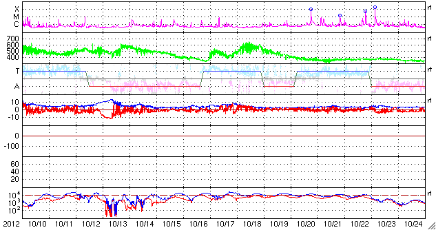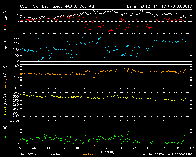 (c) SDO (NASA)、 (動画加工 : 宇宙天気ニュース) ![]() STEREO Ahead衛星より、上のフレアに伴って発生したCME。地球は写真の左方向にある。 (c) STEREO (NASA)、 (動画加工 : 宇宙天気ニュース) ![]() GOES-14のX線カメラによる、太陽の東西で発生するフレア。 (c) NOAA/SWPC 、(動画加工 : 宇宙天気ニュース) ![]() SDO衛星のAIA304カメラによる、太陽の南西で発生したプロミネンスの噴出。 (c) SDO (NASA)、 (動画加工 : 宇宙天気ニュース) ![]() 野辺山電波ヘリオグラフによる、プロミネンスの噴出の様子。 (c) 国立天文台野辺山太陽電波観測所、(動画加工 : 宇宙天気ニュース) ![]() STEREO Ahead衛星より、上のプロミネンスの噴出によって発生したCME。地球は写真の左方向にある。 (c) STEREO (NASA) ![]() SDO衛星のAIA193カメラによる太陽コロナの様子 (c) SDO (NASA) ![]() SDO衛星による太陽の可視光写真。マウスの矢印を写真に重ねると、黒点番号付きの写真に切り替わります。 (c) SDO (NASA) ![]() GOES衛星の太陽X線データ (c) NOAA/SWPC ![]() ACEが観測した太陽風の磁場(1番上の枠、白線は全体の強度、赤線は南北成分) および、太陽風の密度(3番目の橙線)、速度(4番目の黄線) (c) NOAA/SWPC ![]() リアルタイムAE指数 下段のAEグラフの値が高くなると、オーロラ活動が活発化しています。 (c) 京都大学, NICT ![]() 27日の太陽周期に合わせたデータプロット 太陽が同じ面を地球に向けていた27日前の変化から、今後を予想することができます。 (c) 作図:宇宙天気ニュース