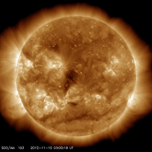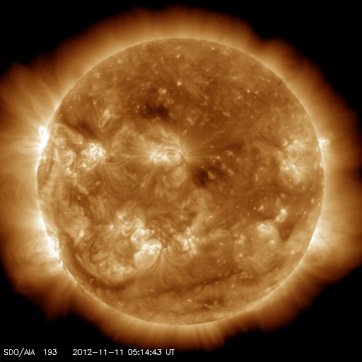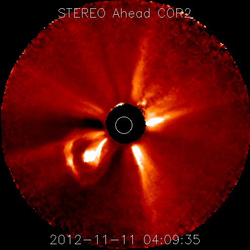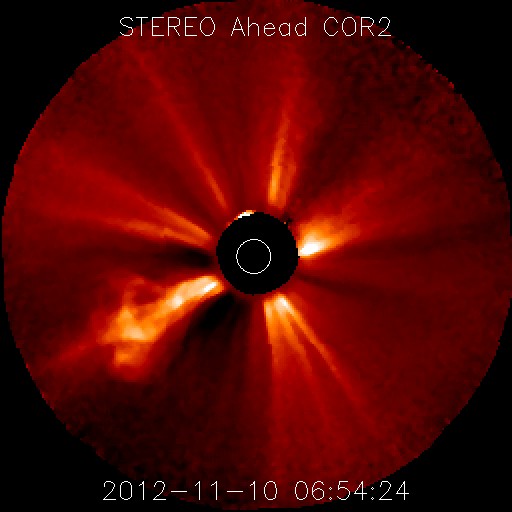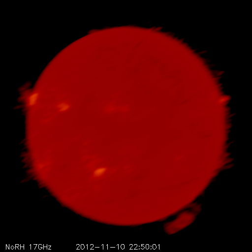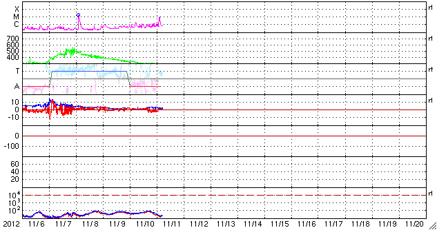 2012/11/11 15:04 更新 太陽でMフレアやプロミネンスの噴出が発生し、にぎやかです。太陽風はとても遅い状態です。 担当 篠原 太陽の活動がにぎわってきました。 昨日の昼、10日14時(世界時10日5時)に、太陽の中央部の南寄りにある、 1508黒点群(掲載の写真では黒点は見えなくなっています)で、 C2.0の小規模フレアが発生しました。 Twitterで飛騨天文台の上野先生より このイベントを紹介していただきました。 ありがとうございます。 SMARTによる写真も掲載されているので、ぜひご覧ください。 このフレアに伴って、CME(太陽ガスの放出現象)も発生しています。 STEREO Ahead衛星COR2カメラの写真を掲載します。 地球のある左方向にガスが噴き出しています。 噴出は南に寄っていますが、地球へも影響はやって来るでしょうか。 地球まで3日程度と考えると、到来は13日頃になりそうです。 また、今日に入った頃から、 太陽の西端と東端で小さなフレアが続くようになり、 今日の昼、11日11時(世界時11日2時)に、 東の端でM1.0の中規模フレアが発生しました。 可視光写真を見ると、 太陽の東端からは南北それぞれに新しい黒点が現われています。 これらの領域が今後どのような活動を起こすのか、 しばらく注目して下さい。 更に、太陽の南西の端で、プロミネンスの噴出が発生しています。 SDO衛星AIA304と、国立天文台の野辺山電波ヘリオグラフによる 動画をご覧ください。 巨大なプロミネンスがゆったりと持ち上がっていく様子がとても印象的です。 この噴出によるCMEをSTEREO Ahead衛星COR2カメラの写真で紹介します。 太陽の端から噴き出しているので、地球への影響はなさそうですが、 まだ発生直後なので、他のデータを見たいところです。 太陽風は、速度が更に下がって、 280km/秒とかなり遅い風になっています。 磁場強度も2nT前後と弱い状態です。 磁気圏も静穏で、AE指数は小さな変化が見られる程度です。 明日くらいまでは、このまま穏やかな太陽風が続き、 その後、CMEやコロナホールの影響で太陽風の乱れが到来しそうです。 オーロラの活動も強まる可能性があるので、 今後の変化に注目してください。 今日は、太陽のあちこちで目立つ現象が発生して、 写真の整理に大慌てでした。 更新がすっかり遅くなり、すみませんでした。