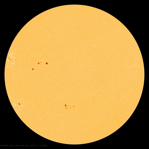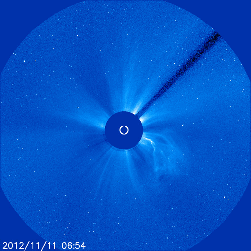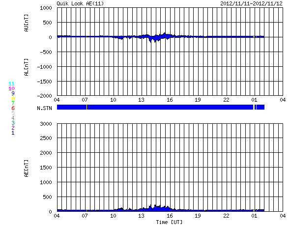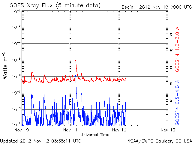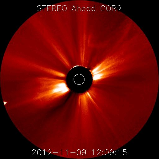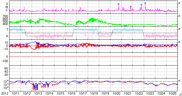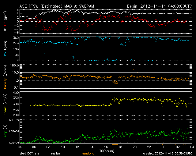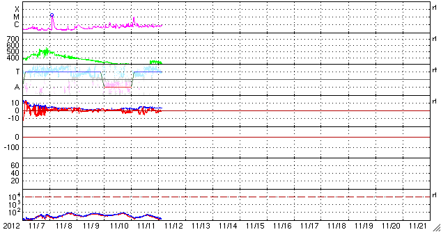 2012/11/12 12:32 更新 太陽風は300km/秒と低速ですが、明日くらいから乱れが到来しそうです。 担当 篠原 太陽は、昨日昼のM1.0以降、 Cクラスに達するフレアはC1.6、C1.2と2回発生しただけですが、 X線のグラフには、小さな変化がたくさん発生しています。 黒点群もあちこちに目立っていて、 今後もCクラスやMクラスのフレアが発生する可能性があります。 昨日のニュースで紹介しましたが、 昨日の朝に太陽の南西部で発生したプロミネンスの噴出によるCMEの様子を、 SOHO衛星LASCO C3の動画で紹介します。 前後の写真が欠けていて、噴出の一部しか見られませんが、 プロミネンスの構造によると思われる、 ガスの白い筋が細かく見えています。 この様子では、このCMEによる地球への影響はなさそうです。 そして、9日頃から続いているCMEの噴出を、 STEREO Ahead衛星COR2の動画でご覧ください。 9日、10日、11日と、左に向かって次々にコロナのガスが噴き出しています。 1つめ(9日)は、10日の記事 2つめ(10日)と3つ目(11日)は、昨日の記事で紹介しています。 (3つめは、前のSOHO衛星の写真と同じCMEです) 1つめと2つめのCMEの影響が、 明日、明後日くらいに地球へ到来する可能性があります。 今夜以降の太陽風のデータに注目してください。 また、一昨日のニュースで紹介しましたが、 小さなコロナホールの影響も、明日、13日頃から始まりそうです。 2つの変化が重なって、太陽風は複雑な変化をするかもしれません。 現在の太陽風は、300km/秒と遅い風が続いています。 今日の未明、12日2時(世界時11日17時)に、 速度が280km/秒から320km/秒に一段上がる変化が見られたのですが、 変化の幅は小さく、その後、速度はまた下がっています。 磁気圏も概ね静穏で、 AE指数は、小さな変化が見られる程度です。 太陽フレアに、太陽風の乱れと、 今週は活発な動きが見られるかもしれません。