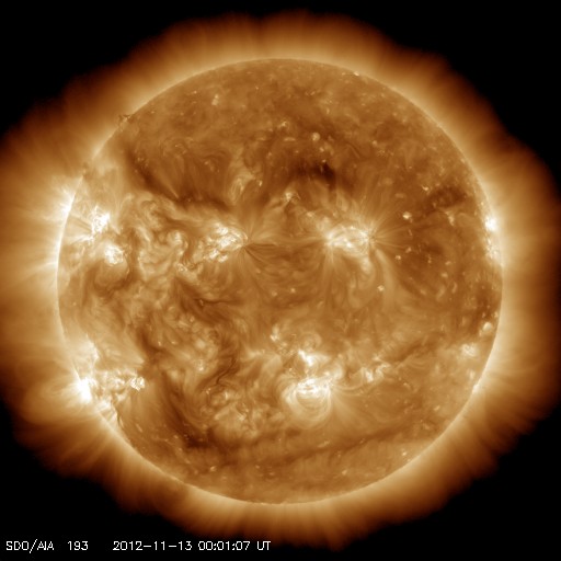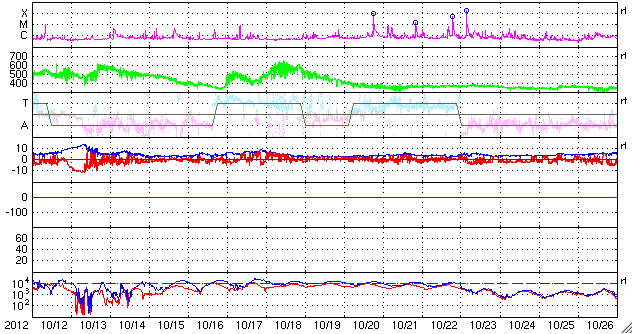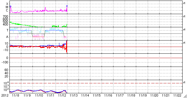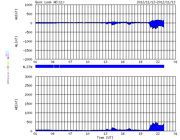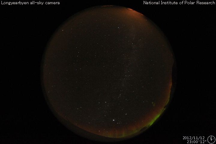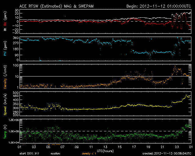 2012/11/13 09:59 更新 太陽風の乱れが到来して、オーロラの活動が強まっています。また、M2.0フレアが発生しました。 担当 篠原 太陽風の乱れが始まりました。 ACE衛星の観測では、13日7時(世界時12日22時)に 太陽風の速度が300km/秒から350km/秒に急に上がり、 磁場強度も、5nTから15nTに急に強まっています。 急な立ち上がりをしていることから、CMEの影響も到来している様です。 その後、太陽風の速度は450km/秒、 磁場強度は20nTへと強まっています。 そして、地球磁気圏への影響度を決める磁場の南北成分は、 ±15nTくらいの範囲で大きく変動しています。 磁気圏では、AE指数に400nTと小さな変化が始まっていますが、 これは、太陽風の乱れが到来する前に続いていた、 太陽風磁場の南向きの影響です。 現在到来している太陽風の乱れによる磁気圏の活動は、 このデータの後から強まると考えられます。 今後のAE指数の変化は、更に大きくなるだろうと思います。 このタイミングに合わせたかのように、 国立極地研究所がノルウェー・スバールバル島のLongyearbyenに設置している、 全天カメラのオーロラ観測が昨夜から始まっています。 撮影されたばかりのオーロラの様子を、動画でご覧ください。 また、現在、カナダ・イエローナイフのライブカメラでも、 オーロラの輝きが捉えられています。 アラスカ・フェアバンクスも晴天の様で、 今夜は月もなく、オーロラ観望には絶好の夜となりそうです。 太陽風の乱れは、2日連続で発生したCMEと、 小さいですがコロナホールの重なりによって、 明日くらいまでは続くのではないでしょうか。 太陽では、今朝、13日8時(世界時12日23時)に、 南東部の1613黒点群で、M2.0の中規模フレアが発生しました。 1時間後にも、C4.3のフレアが発生しています。 GOES衛星のX線カメラの動画を見ていると、 1613群だけでなく、1610群や、1614群、 更に、東端のまだ見えていない領域など、 あちこちで小さな変動が続いています。 今後も、フレアの発生が見られそうです。