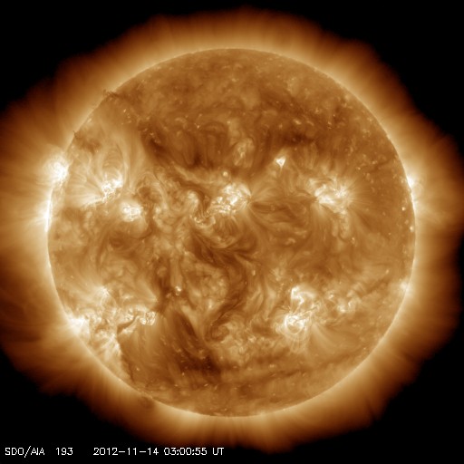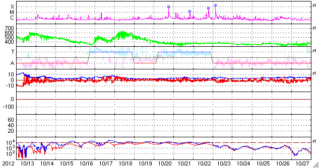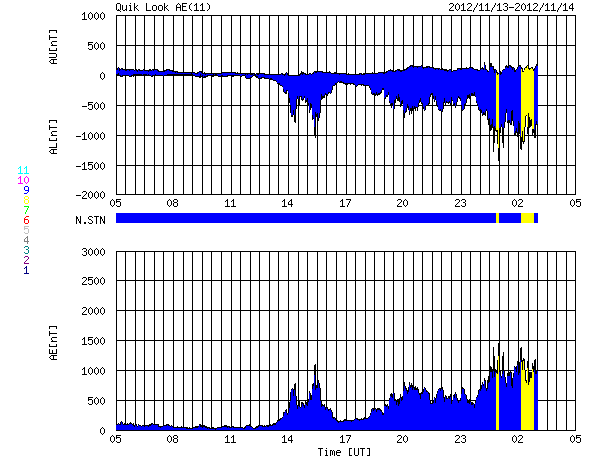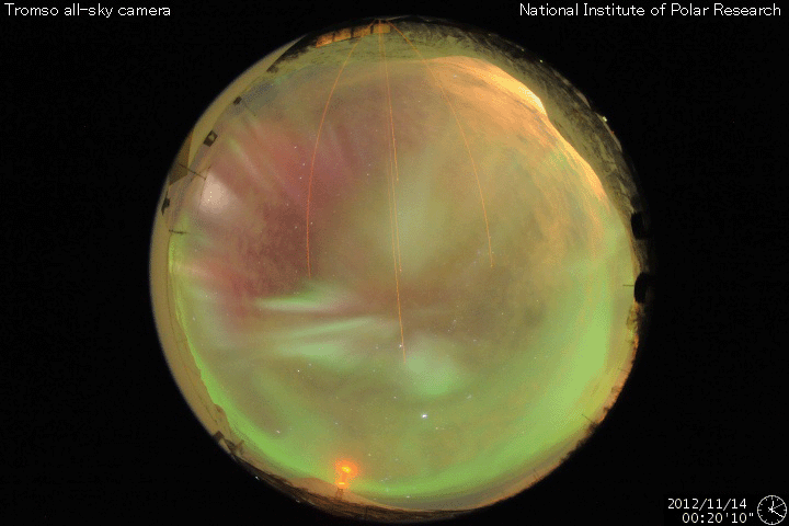 2012/11/14 13:16 更新 太陽風磁場が南向きに強まり、活発なオーロラ活動が発生しています。中規模フレアも続いています。 担当 篠原 昨日の夕方、13日17時(世界時13日8時)に、 太陽風の乱れの第二波がやって来ました。 太陽風の磁場強度が、それまでも10nTに強まっていたのですが、 更に20nTへ強まっています。 一方、速度の変化は特にありませんでした。 太陽風磁場の南北成分は、 始めは北向きに+20nT近くまで振れていたのですが、 時間とともに0nTに近づき、 14日2時(世界時13日17時)に南向きに切り替わりました。 その後は、南向きが強まって、 今朝、14日8時(世界時13日23時)以降は、 -15nT程度の強い南向きになっています。 この影響で、磁気圏のオーロラ活動も激しくなっています。 AE指数のグラフは、 800nTから1000nTを超える活発な変動が続いています。 国立極地研究所による、 ノルウェー・トロムソのオーロラの様子を動画でご覧ください。 世界時14日0時以降の動画で、 AE指数が1000nTに達する激しい変化を記録していた頃の様子です。 現在の太陽風の磁場強度は、急に10nTに下がっています。 磁場の南向き成分も、一気に -5nT近くに弱まっています。 太陽風の乱れは、終息に近づいているようですが、 このまますぐに終わってしまうのか、もうしばらく続くのか、 この後の変化に注目してください。 もうしばらく続くと、 アラスカのライブカメラでにぎやかな光景が見られそうですが。 太陽は、1613黒点群で、M6.0、M2.5、M2.8、M1.1(ちょうど起きました) と4回の中規模フレアと、 Cクラスフレアが多数の発生して、活発な活動が続いています。 太陽全体では、黒点が多数見えていて、 その他の領域の活動にも注目してください。 ![]() ノルウェー・トロムソの全天カメラにより撮影された、激しいオーロラの活動。 (c) 国立極地研究所、(動画加工 : 宇宙天気ニュース) ![]() SDO衛星のAIA193カメラによる太陽コロナの様子 (c) SDO (NASA) ![]() SDO衛星による太陽の可視光写真。マウスの矢印を写真に重ねると、黒点番号付きの写真に切り替わります。 (c) SDO (NASA) ![]() ACEが観測した太陽風の磁場(1番上の枠、白線は全体の強度、赤線は南北成分) および、太陽風の密度(3番目の橙線)、速度(4番目の黄線) (c) NOAA/SWPC ![]() リアルタイムAE指数 下段のAEグラフの値が高くなると、オーロラ活動が活発化しています。 (c) 京都大学, NICT ![]() 27日の太陽周期に合わせたデータプロット 太陽が同じ面を地球に向けていた27日前の変化から、今後を予想することができます。 (c) 作図:宇宙天気ニュース