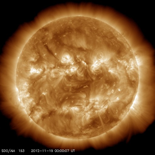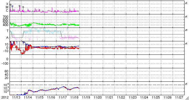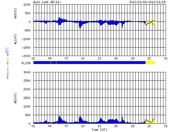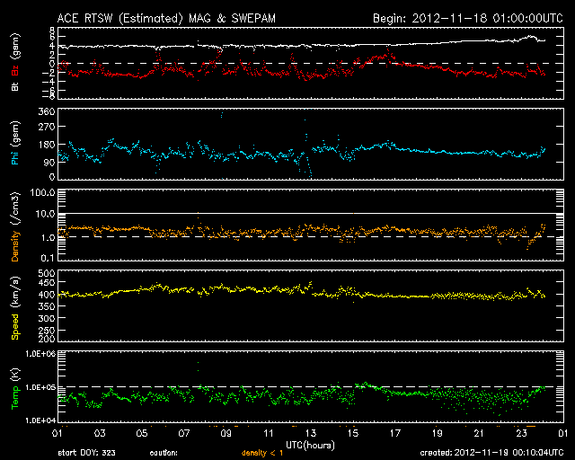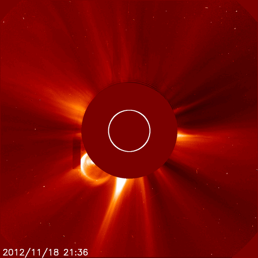 2012/11/19 09:10 更新 太陽南東でプロミネンスの噴出が起きました。太陽風は平均的な状態です。 担当 篠原 太陽の南東端で、プロミネンスの噴出が発生しています。 豪快に噴き上がっていく様子を、SDO衛星AIA304の動画でご覧ください。 この噴出によって、CMEも南東に向かって飛び出しています。 噴き上がって行ったのが今朝なので、途中までの写真ですが、 地球方向から見たSOHO衛星LASCO C2カメラと、 太陽を右向こう側から見たSTEREO Ahead衛星COR2カメラを つなげて動画にしました。 STEREO Ahead衛星の写真では、地球は左側にあります。 CMEは太陽の横方向に噴き出しているので、地球への影響はありません。 太陽では、C4.3とC1のフレアが4回ほど発生しています。 GOES衛星のX線カメラを見ていると、 あちこちで小さな活動が起きています。 Cクラス程度のフレアは、この後も続きそうです。 太陽風は、400km/秒前後の平均的な速度が続いています。 磁場強度も、4nTで安定しています。 磁場の南北成分は、振れ幅は小さいですがずっと南寄りに振れています。 このため、磁気圏でも小規模のオーロラ活動が続いているようで、 AE指数のグラフは、小さな変化が断続的に発生しています。 太陽風は、この後も穏やかな風が続きそうですが、 磁場の南寄りの傾向も続けば、オーロラの観望は楽しめそうです。 ![]() SDO衛星のAIA304カメラによる、太陽の南東端で発生したプロミネンスの噴出。 (c) SDO (NASA)、 (動画加工 : 宇宙天気ニュース) ![]() SOHO LASCO C2カメラと、STEREO Ahead COR2カメラによる、太陽の東側へ噴出したCME。 (c) SOHO (ESA & NASA)、STEREO (NASA)、(動画加工 : 宇宙天気ニュース) ![]() SDO衛星のAIA193カメラによる太陽コロナの様子 (c) SDO (NASA) ![]() SDO衛星による太陽の可視光写真。マウスの矢印を写真に重ねると、黒点番号付きの写真に切り替わります。 (c) SDO (NASA) ![]() GOES衛星の太陽X線データ (c) NOAA/SWPC ![]() ACEが観測した太陽風の磁場(1番上の枠、白線は全体の強度、赤線は南北成分) および、太陽風の密度(3番目の橙線)、速度(4番目の黄線) (c) NOAA/SWPC ![]() リアルタイムAE指数 下段のAEグラフの値が高くなると、オーロラ活動が活発化しています。 (c) 京都大学, NICT ![]() 27日の太陽周期に合わせたデータプロット 太陽が同じ面を地球に向けていた27日前の変化から、今後を予想することができます。 (c) 作図:宇宙天気ニュース