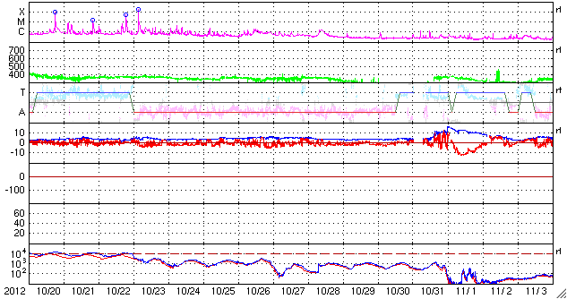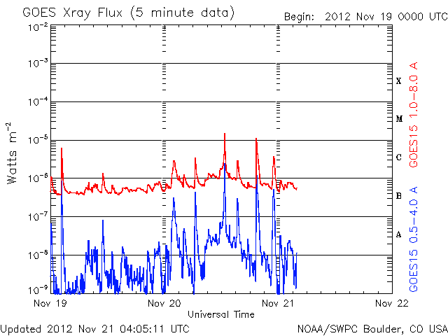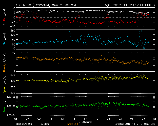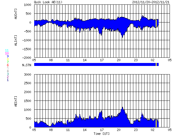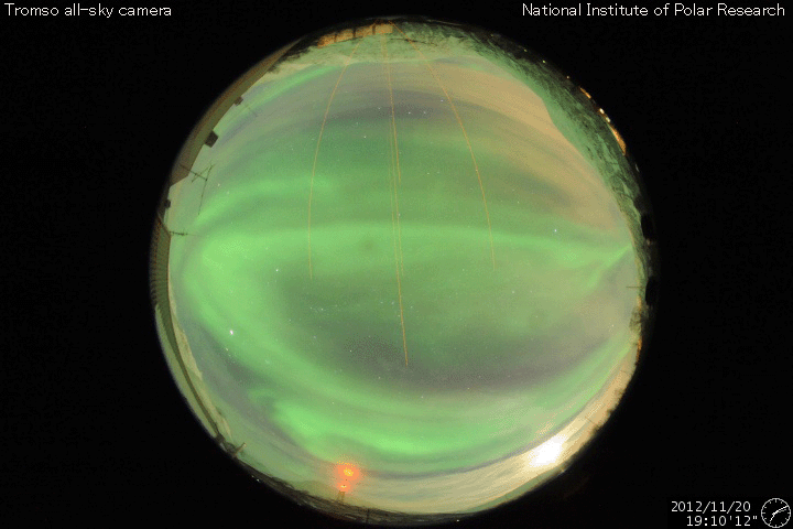 2012/11/21 13:06 更新 太陽風磁場が南向きにやや強まり、活発なオーロラを起こしています。 担当 篠原 昨日のニュース以降、太陽風磁場の南向き傾向がやや強まり、 -5nT程度の南向きが、長い時間続きました。 速度も、400km/秒から450km/秒へ少し高まっています。 太陽風の変化により、磁気圏のオーロラ活動も強まっています。 AE指数は、連続的に500nTに達する変化を記録し、 800nTや1000nTに達する大きな変化も発生しています。 今日は、ノルウェー・トロムソの全天カメラで撮影された 世界時20日19時頃のオーロラの様子を紹介します。 昨日の動画が静かな光の帯だったのに対し、 今日の動画はオーロラの光が空全体を激しく覆っています。 太陽風の速度は、若干上がっていますが、 特に大きく変化することはなさそうです。 また、太陽風磁場の南寄りの傾向が今後も続けば、 引き続いて活発なオーロラを楽しむことができるでしょう。 太陽では、1618黒点群でM1.7、M1.6の中規模フレアや、 Cクラスのフレアが5回程度発生しています。 黒点の規模も拡大しているようです。 また、この群以外にも、 太陽のあちこちで小さな活動が続いています。 繋がるように次々と活動が起きている様子を、 GOES 15衛星のX線カメラによる動画で紹介します。 引き続き、MクラスやCクラスのフレアが発生しそうです。