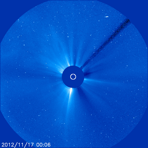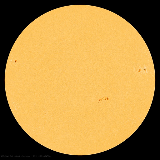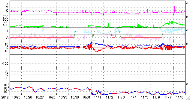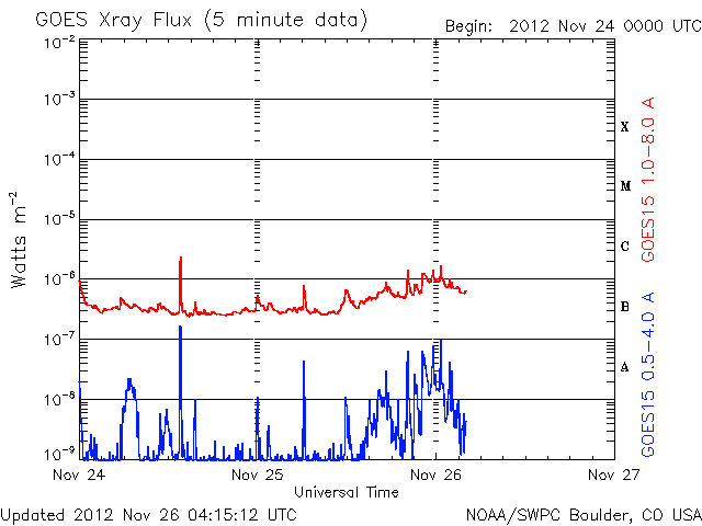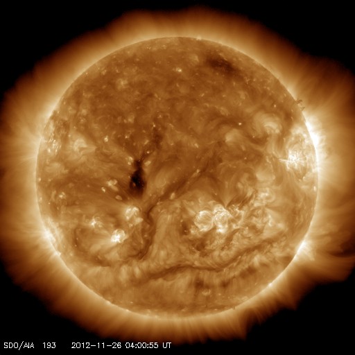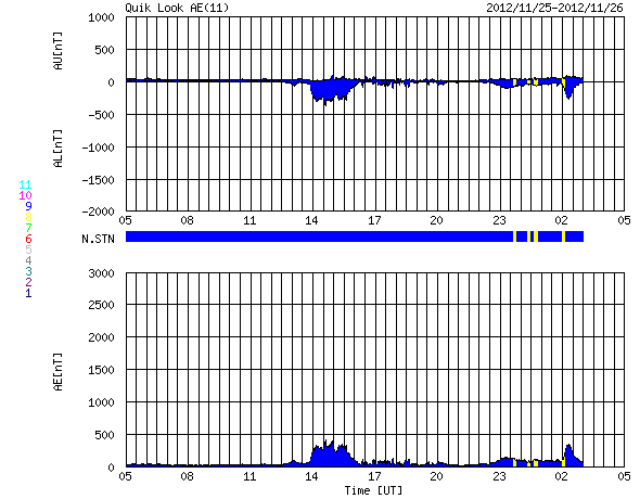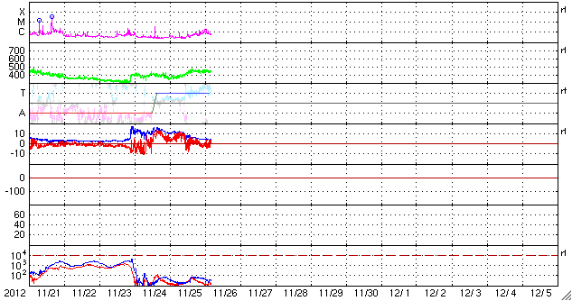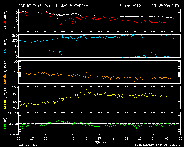 2012/11/26 13:16 更新 1620黒点群が大きくなっています。今夜以降に24日のCMEの影響が到来しそうです。 担当 篠原 太陽は、現在さそり座を通過中です。 SOHO衛星LASCO C3の写真を17日から繋げると、 サソリの上半身が写真の東から次第に姿を現し、 今日は太陽が頭の部分を通過しているところです。 写真の左下には、一等星のアンタレスが光り、 そのとなりに小さく球状星団のM4も写っています。 その太陽では、南半球の1620黒点群が急に発達しています。 24時間前である昨日のニュースの写真と比較して下さい。 消えそうだった黒点群が、一気に黒点の数を増やしています。 1620群はC1.4の小規模フレアを起こしていますが、 今のところ、特に活動度が高まっているという印象はありません。 引き続きこの群の動きに注目して下さい。 太陽風は、昨夜から速度が少し上昇して、 350km/秒の低速風から450km/秒とやや高速の風に変わりました。 磁場強度は、強まっていた10nTから平均的な強さの5nTへ、 ゆっくりと下がっています。 一方、21日のCMEに関係すると分かるような はっきりした太陽風の変化は見られませんでした。 現在の太陽風の乱れの中に含まれてしまったのかもしれません。 太陽風磁場は北寄りの状態が続いていて、 磁気圏への影響は弱くなっています。 AE指数は小規模の変化が見られる程度です。 また、今夜か明日くらいに、 24日に紹介したCMEによる太陽風の乱れが到来しそうです。 磁場が南向きに強まると、活発なオーロラの活動が期待できます。