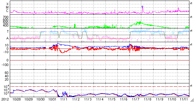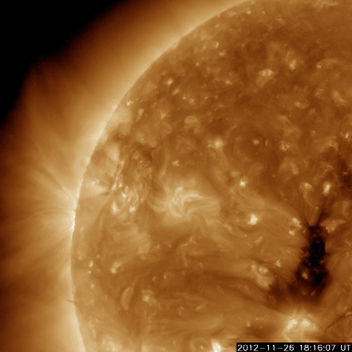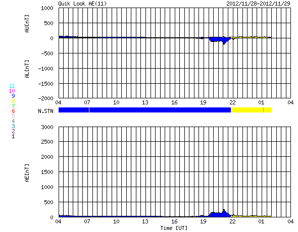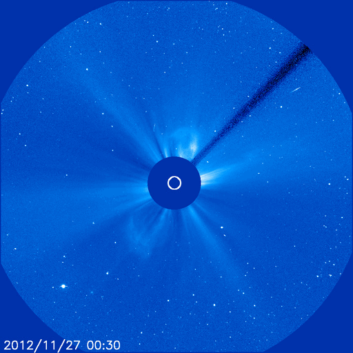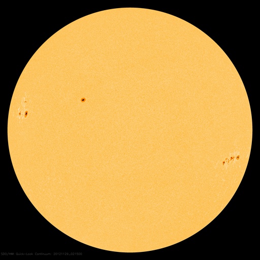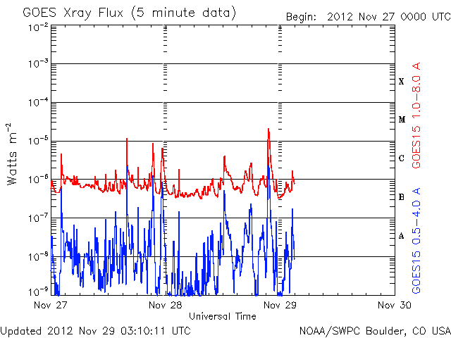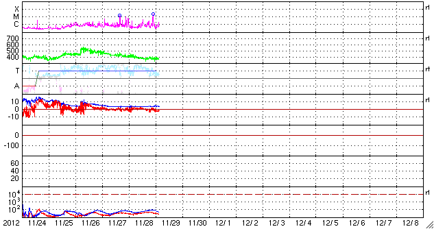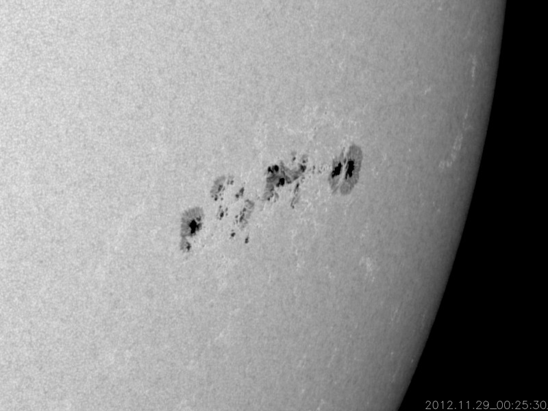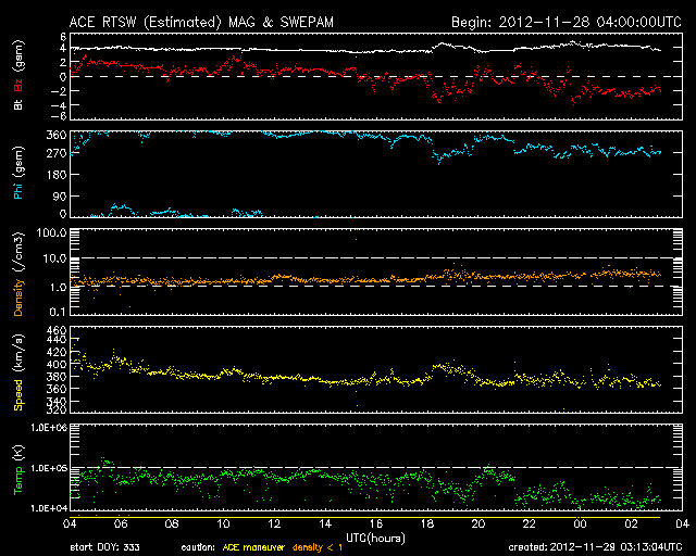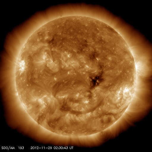 2012/11/29 12:14 更新 1620黒点群でM2フレアが発生しました。太陽風は明日くらいに高速風が到来しそうです。 担当 篠原 1620黒点群は、大きな姿を保っていますが、 次第に西の端に近付いてきました。 SDO衛星による拡大写真をご覧ください。 1620群は、今朝、29日6時半(世界時28日21時半)に M2.2の中規模フレアを起こし、 その他にも、C4、C3などのCクラスフレアを数回起こしています。 活動は続いていますが、特に強まってはいません。 東から上がってきた1623黒点群も、 昨日の昼に、C3.1のフレアを起こした程度です。 太陽では、一昨日、27日の昼に、東側でフィラメント噴出が発生し、 CME(太陽ガスの放出現象)が発生していました。 SDO衛星AIA193の動画では、黒い細い筋(ダークフィラメント)が、 勢い良く噴き上がる様子が見え、 その後、コロナでループ状のプロミネンスが輝いています。 そして、SOHO衛星LASCO C3では、太陽の左上方向を中心に、 コロナのガスが激しく噴き上がっています。 地球からは斜め方向の噴出ですが、 ある程度、こちらにも向かっている可能性があります。 明日の午後から明後日にかけて、 このCMEに関係する太陽風の乱れが到来する可能性があります。 一方、今日の太陽のコロナ写真(SDO衛星AIA193)を見ると、 中心部のコロナホールは西に進み、 明日くらいに地球へ影響が及び始める目安の位置に達します。 ここからの高速風とCMEの擾乱が、 重なった形で地球にやって来るかもしれません。 太陽風は、速度は370km/秒とやや低速になりました。 磁場強度は4nTで安定しています。 磁気圏は静穏で、AE指数はほとんど変化していませんでした。 グラフの最後で小さな変化が発生していますが、 これは、太陽風磁場の南北成分が、 南寄りに変わっていることと関係しているのでしょう。 この傾向が続くようだと、 小さなオーロラの活動が見られるかもしれません。 ![]() SDO衛星による、1620黒点群の拡大写真。 (c) SDO (NASA) ![]() SDO衛星AIA193カメラによる、太陽の東側で発生したフィラメントの噴出。 (c) SDO (NASA)、 (動画加工 : 宇宙天気ニュース) ![]() SOHO衛星LASCO C3カメラによる、太陽から北東寄りへ噴出するCME。 (c) SOHO (ESA & NASA)、 (動画加工 : 宇宙天気ニュース) ![]() SDO衛星のAIA193カメラによる太陽コロナの様子 (c) SDO (NASA) ![]() SDO衛星による太陽の可視光写真。マウスの矢印を写真に重ねると、黒点番号付きの写真に切り替わります。 (c) SDO (NASA) ![]() GOES衛星の太陽X線データ (c) NOAA/SWPC ![]() ACEが観測した太陽風の磁場(1番上の枠、白線は全体の強度、赤線は南北成分) および、太陽風の密度(3番目の橙線)、速度(4番目の黄線) (c) NOAA/SWPC ![]() リアルタイムAE指数 下段のAEグラフの値が高くなると、オーロラ活動が活発化しています。 (c) 京都大学, NICT ![]() 27日の太陽周期に合わせたデータプロット 太陽が同じ面を地球に向けていた27日前の変化から、今後を予想することができます。 (c) 作図:宇宙天気ニュース