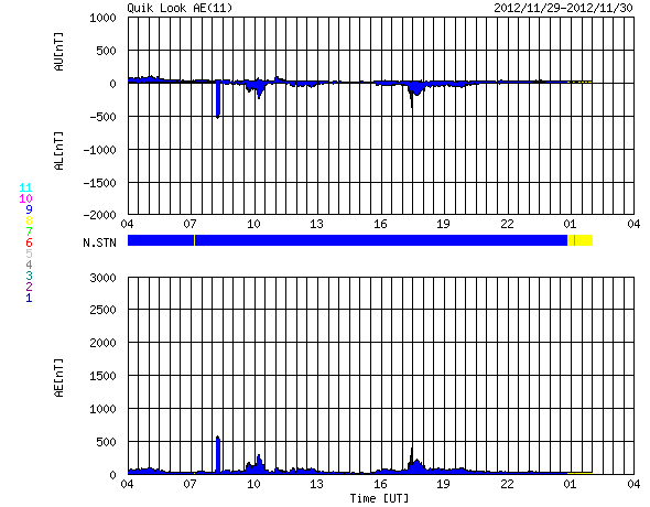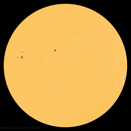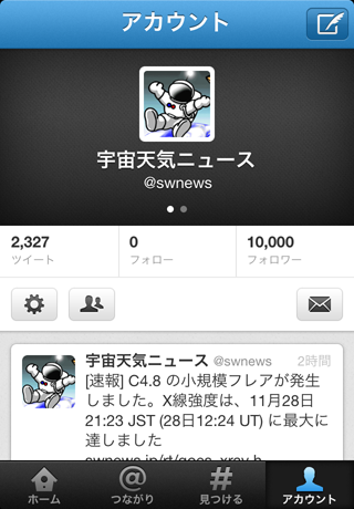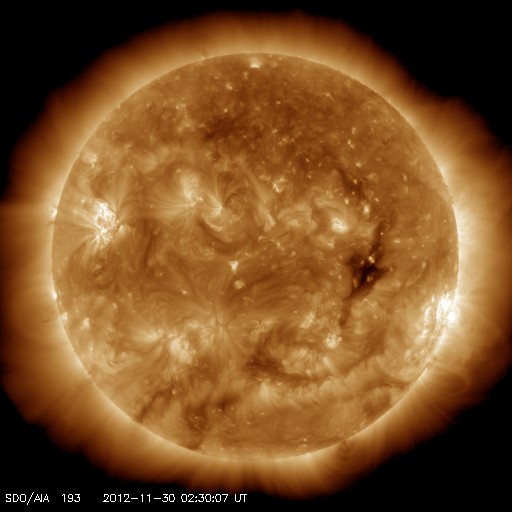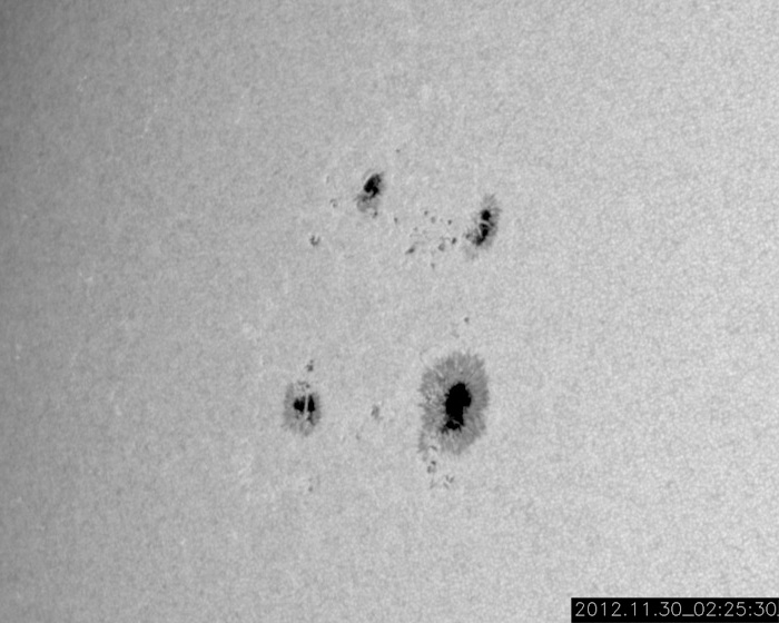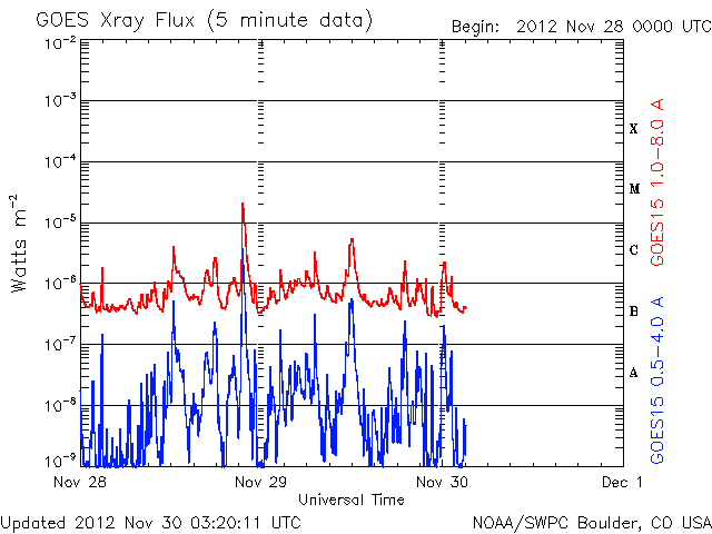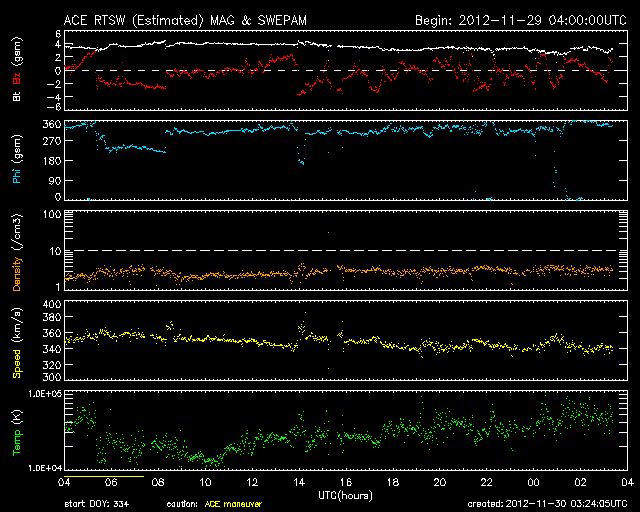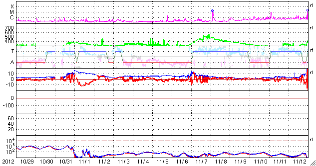 2012/11/30 12:25 更新 太陽風は低速です。この後、太陽風の乱れが到来する可能性があります。 担当 篠原 1620黒点群は西に沈みつつあります。 そして、フレアの発生は、東側の1623群と、その上に発生した1625群が 中心になっています。 昨夜、29日21時(世界時29日12時)に、1623群で発生したC5.8が最も大きく、 その他にC1〜2の小さなフレアを10回程度起こしています。 1623群と1625群は、ちょうど南北に並んでいて、 4個セットみたいに見えています。 面白いので、拡大写真を掲載します。 この後も、CクラスからMクラスのフレアが発生する可能性があります。 太陽風は低速の状態が続いています。 速度は340km/秒ともう一段下がり、磁場強度も3nT近くに弱まっています。 磁気圏も静穏で、AE指数は小さな変化が見られる程度です。 太陽風は、これから、CMEとコロナホールの影響で、 速度が高まったり、磁場強度が強まるなどの変動が発生する可能性があります。 CMEは、昨日のニュースで動画を紹介しています。 コロナホールは、今日のSDO衛星AIA193では、 太陽の西側に半分ほど進んでいて、 地球に影響が及び始める目安の位置に達しています。 磁場が南向きに強まれば、活発なオーロラが見られる可能性があります。 オーロラのライブカメラで楽しめるかもしれません。 一昨日、28日の夜にTwitterのアカウント(@swnews)のフォロワー数が、 ちょうど10,000人になっていました。 思わず記念写真を撮ったので、紹介します。 ご覧頂いてありがとうございます。 ![]() SDO衛星による、1623黒点群(下の2個)と1625黒点群(上の2個)の拡大写真。 (c) SDO (NASA) ![]() 一昨日、28日の夜のフォロワー数はぴったり10,000人でした。どうもありがとうございます。 (c) 宇宙天気ニュース ![]() SDO衛星のAIA193カメラによる太陽コロナの様子 (c) SDO (NASA) ![]() SDO衛星による太陽の可視光写真。マウスの矢印を写真に重ねると、黒点番号付きの写真に切り替わります。 (c) SDO (NASA) ![]() GOES衛星の太陽X線データ (c) NOAA/SWPC ![]() ACEが観測した太陽風の磁場(1番上の枠、白線は全体の強度、赤線は南北成分) および、太陽風の密度(3番目の橙線)、速度(4番目の黄線) (c) NOAA/SWPC ![]() リアルタイムAE指数 下段のAEグラフの値が高くなると、オーロラ活動が活発化しています。 (c) 京都大学, NICT ![]() 27日の太陽周期に合わせたデータプロット 太陽が同じ面を地球に向けていた27日前の変化から、今後を予想することができます。 (c) 作図:宇宙天気ニュース