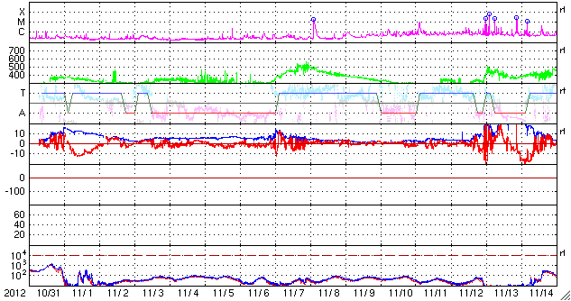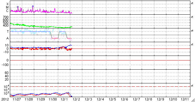 - 2012/11/27 13:26 1620黒点群でCクラスの小さなフレアが続いています。太陽風にCMEによる乱れが来ました。