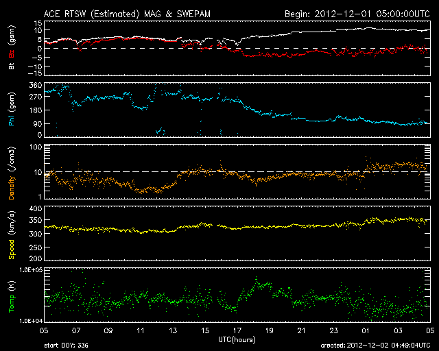 - 2012/11/30 12:25 太陽風は低速です。この後、太陽風の乱れが到来する可能性があります。