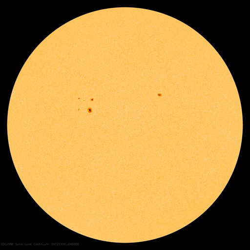 SDO衛星による太陽の可視光写真。マウスの矢印を写真に重ねると、黒点番号付きの写真に切り替わります。