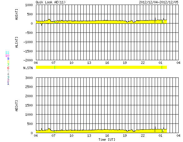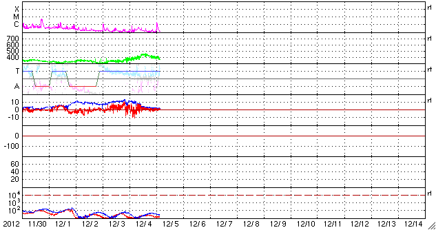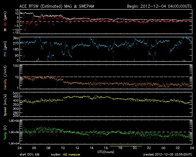 2012/12/ 5 12:58 更新 太陽風の速度は450km/秒に少し高まりました。現在は下がっています。 担当 篠原 太陽風の速度は、昨夜、4日19時(世界時4日10時)頃に 450km/秒近くまで高まりました。 その後ゆっくりと低下して、 現在は370km/秒と再び低速の風に戻っています。 一方、磁場強度は速度の高まりとともに弱まり、 昨夜以降は5nTを割って、2〜3nTと現在は弱くなっています。 磁場の南北成分は、昨日のニュース以降は北寄りに戻っています。 そのため磁気圏は穏やかで、 AE指数のグラフはほとんど変化していません。 27日周期の図を見ると、太陽風速度の高まりは、 前周期に比べるとずいぶん小さくなってしまいました。 来月は消えてしまいそうです。 SDO衛星AIA193の太陽コロナ写真を見ると、 コロナホールは特に見られず、 太陽風はこの後も穏やかな状態が続きそうです。 太陽のフレア活動は穏やかな状態が続いています。 今朝、5日9時(世界時5日0時)にC1.7の小規模フレアが起きています。 発生箇所は、太陽の東の端です。 この後、どの様な領域が現われるでしょうか。 ![]() SDO衛星のAIA193カメラによる太陽コロナの様子 (c) SDO (NASA) ![]() SDO衛星による太陽の可視光写真。マウスの矢印を写真に重ねると、黒点番号付きの写真に切り替わります。 (c) SDO (NASA) ![]() ACEが観測した太陽風の磁場(1番上の枠、白線は全体の強度、赤線は南北成分) および、太陽風の密度(3番目の橙線)、速度(4番目の黄線) (c) NOAA/SWPC ![]() リアルタイムAE指数 下段のAEグラフの値が高くなると、オーロラ活動が活発化しています。 (c) 京都大学, NICT ![]() 27日の太陽周期に合わせたデータプロット 太陽が同じ面を地球に向けていた27日前の変化から、今後を予想することができます。 (c) 作図:宇宙天気ニュース