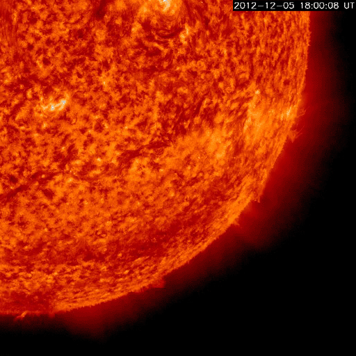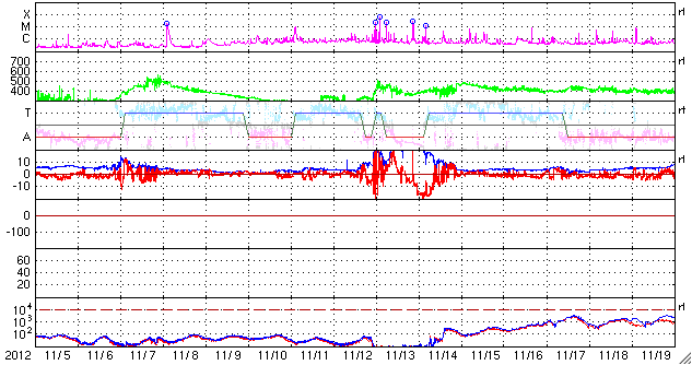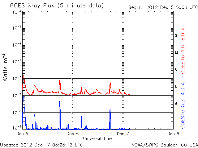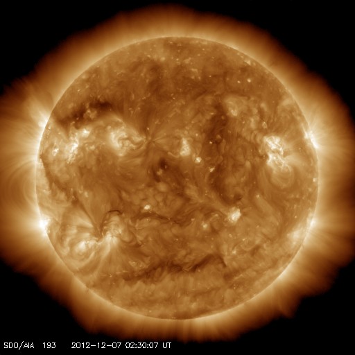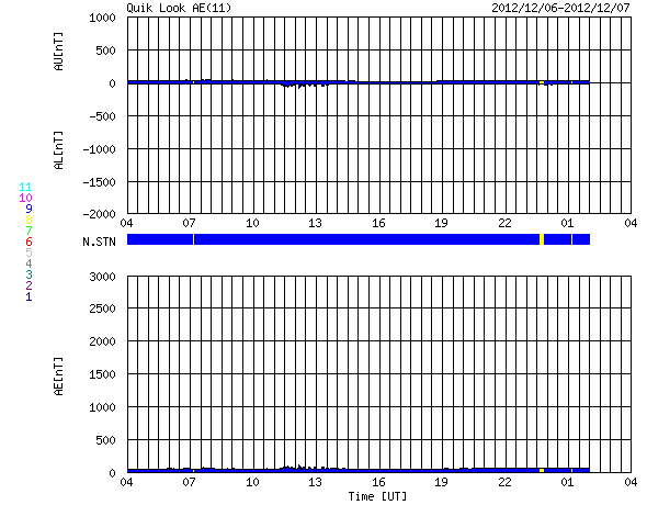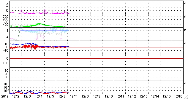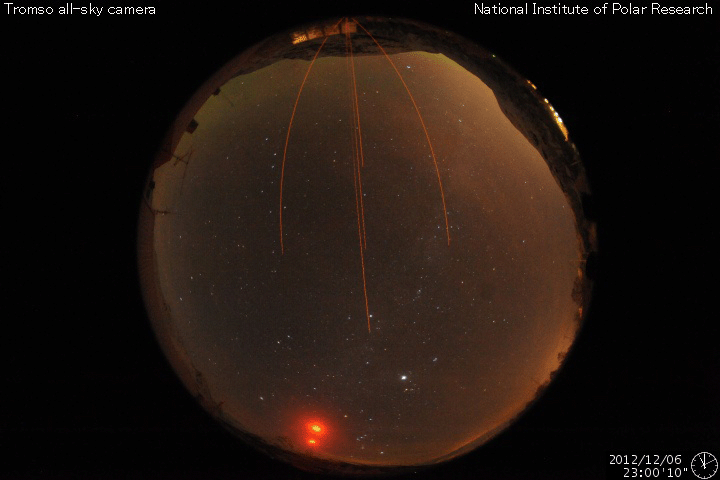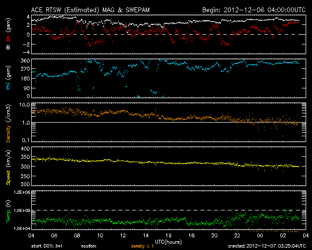 2012/12/ 7 12:26 更新 太陽風は300km/秒とだいぶ低速です。太陽のフレア活動も静かです。 担当 篠原 太陽、太陽風ともに穏やかな状態が続いています。 ACEのデータでは、太陽風の速度(黄色線)は300km/秒まで下がり、 だいぶ遅い風になっています。 磁場強度も、3nTに弱まったままです。 磁場の南北成分は、振れ幅が小さい上に、 比較的北寄りに振れている様です。 このため、磁気圏もとても静かで、 AE指数のグラフは全く変化していません。 ノルウェー・トロムソの全天カメラを見ると、 北の地平線近く(写真では上端)で、 弱いオーロラがゆらゆらと揺れています。 太陽風が弱いと、普段よりも高緯度側に現れたりします。 低速の穏やかな太陽風は、このまましばらく続きそうです。 太陽は、1623、1625黒点群が小さく、目立たなくなり、 全体的にさみしい太陽面です。 フレア活動も小さく、 1628黒点群の場所でBクラスの小さなフレアが続いている程度です。 また、太陽では南東部でフィラメントの噴出が発生しています。 SDO衛星AIA304の動画をご覧ください。 CMEも噴き出していますが、地球の方向には向かっていないようです。
