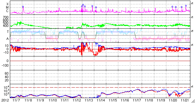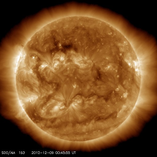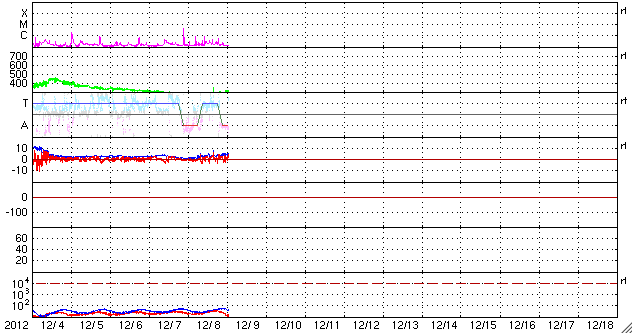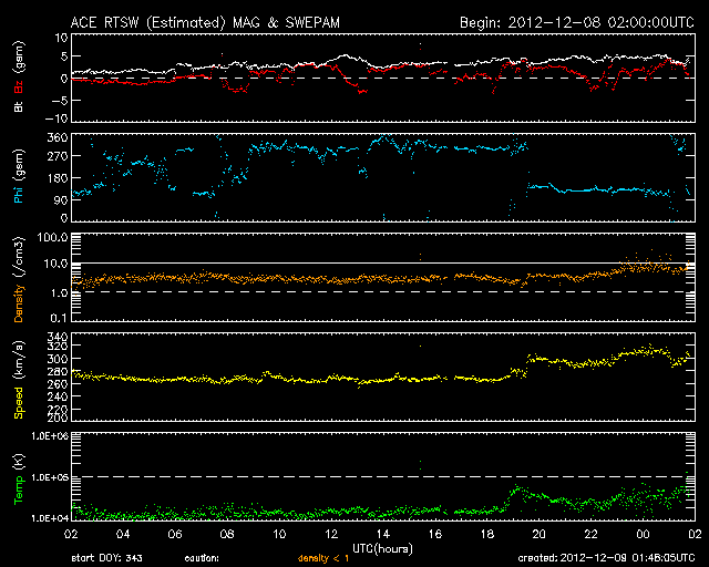 2012/12/ 9 10:49 更新 太陽風は300km/秒を割る低速風が続いています。磁気圏も静穏です。 担当 篠原 速度の遅い太陽風が続いています。 ACE衛星の観測によると、早朝、9日4時(世界時8日19時)頃に、 太陽風の速度が270km/秒から300km/秒に上がる小さな変化がありました。 磁場強度も少し高まって、5nTと平均的な強度に戻っています。 27日周期の図を見ると、 太陽風磁場の大まかな方向が切り替わる、 セクター境界を越えたことに関係する変化の様です。 今回は「T:地球から太陽方向」から 「A:太陽から地球方向」に変わっています。 方向の切り替わりそのものに大きな影響はありません。 その後も低速風の状態は変わらず、 現在の速度は280km/秒、磁場強度は3nTです。 磁気圏も静穏で、AE指数はとても小さな変化が所々見えている程度です。 SDO衛星AIA193では、コロナホールは見られず、 今後も穏やかな太陽風が続きそうです。 太陽は、昨日のニュースの頃に見え始めていた北東部の黒点に、 1629黒点群と番号が付けられました。 その右上に、そっくりな形の黒点がもう1セット現われています。 明日には番号が付くでしょう。 この1629黒点群でBクラスの小さなフレアが頻繁に発生しています。 X線のグラフでは、やや落ち着いてしまったような印象もあります。 新しい黒点が現われたこともあり、 この後、どのような活動が見られるでしょうか。 ![]() SDO衛星のAIA193カメラによる太陽コロナの様子 (c) SDO (NASA) ![]() SDO衛星による太陽の可視光写真。マウスの矢印を写真に重ねると、黒点番号付きの写真に切り替わります。 (c) SDO (NASA) ![]() ACEが観測した太陽風の磁場(1番上の枠、白線は全体の強度、赤線は南北成分) および、太陽風の密度(3番目の橙線)、速度(4番目の黄線) (c) NOAA/SWPC ![]() リアルタイムAE指数 下段のAEグラフの値が高くなると、オーロラ活動が活発化しています。 (c) 京都大学, NICT ![]() 27日の太陽周期に合わせたデータプロット 太陽が同じ面を地球に向けていた27日前の変化から、今後を予想することができます。 (c) 作図:宇宙天気ニュース