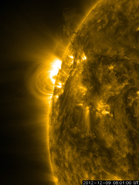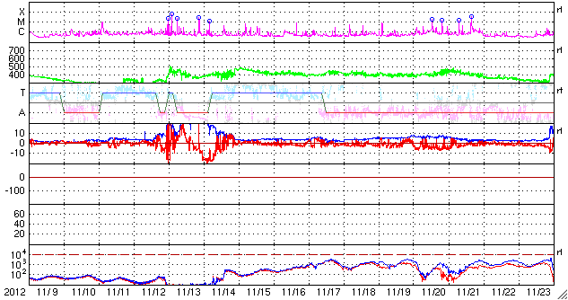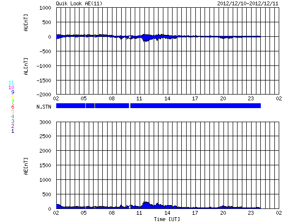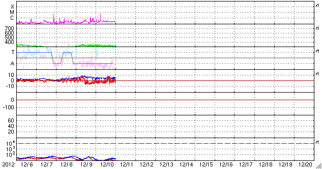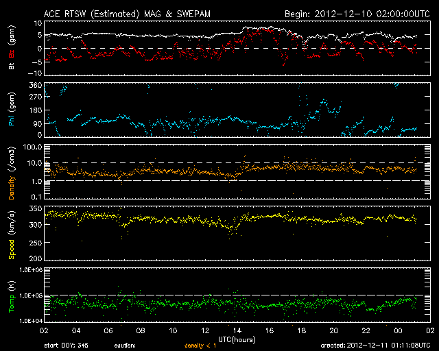 2012/12/11 10:11 更新 太陽風は300km/秒台前半の低速風が続いています。太陽の活動も穏やかです。 担当 篠原 低速の太陽風が続いています。 速度は、340km/秒から320km/秒へより低下しています。 磁場強度は、一時的に8nTに少し強まった時間帯もありますが、 全体としては5nTと平均的な強度で安定しています。 太陽風磁場の南寄りの傾向は、日本時間で昨日いっぱい続きました。 現在は0nTをはさんで、南北に振れています。 AE指数のグラフは小さな変化が数回発生している程度で、 ノルウェー・トロムソの全天カメラでも、 弱いオーロラが一時的に見られた程度で、 穏やかな状態でした。 SDO衛星AIA193の太陽コロナ写真では、 北半球中央の高緯度寄りに小さなコロナホールが見えています。 緯度が高めであることと、小さいことから、 地球への影響はほとんどなさそうです。 また、この写真では、南東部にも少し広いコロナホールが見えています。 こちらも緯度は高めですが、広さがあるので、 ある程度影響はやって来るかもしれません。 5〜6日後くらいになりそうです。 太陽は、中央部の1630黒点群で 10日15時(世界時10日6時)にC5.5の小規模フレアが発生しています。 しかし、以降は目立ったフレアの発生もなく、穏やかな状態です。 太陽の東端で、コロナのループ構造などの美しい動きを SDO衛星AIA171カメラで見ることができました。 動画を掲載しますのでご覧ください。 1日半ほどの映像です。